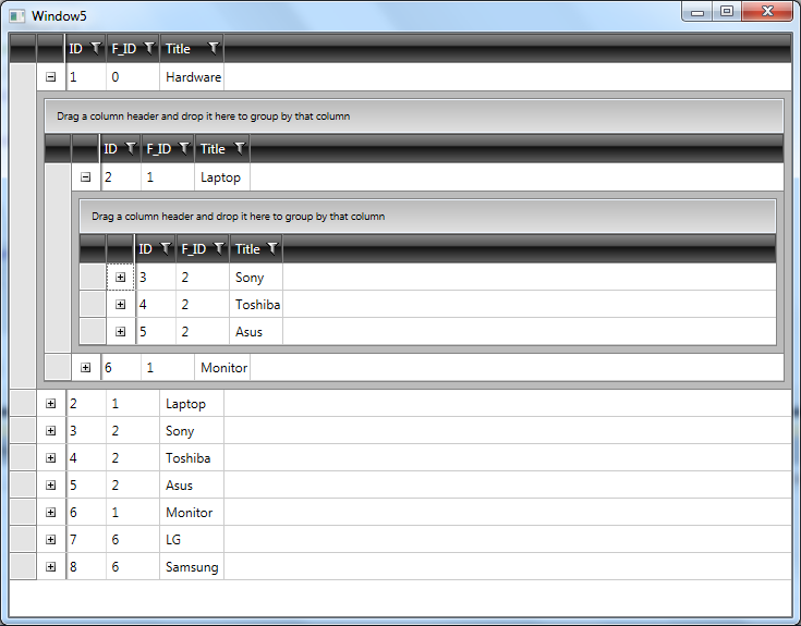 1) How I could hide the "Laptop", "Sony", "Toshiba", "Asus" from root of radGridView. Because they are the child of "Hardware", I want to see them ONLY when the "Hardware" item, is expanded.
