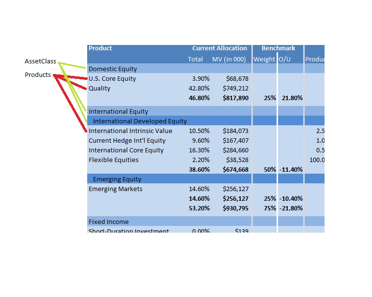 The ProductHoldingsWithAllocationViewModel has properties such as ProductName etc., which are to be displayed in columns. Attached is a sample of what it should look like.The AssetClass in the picture is in the