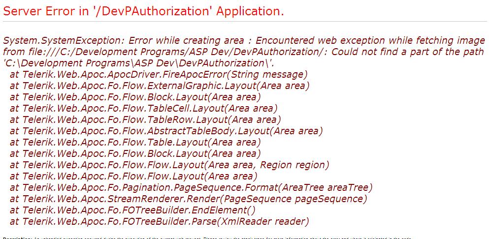 If use use expand/collapse Expand/Collapse ImageUrl from a File via ColumnCreated event, I got the attached error message while exporting to PDF. But If i do not call Column created event in Radgrid thus by using default Expand/Collapse ImageURL, the PDF export works fine. Also if I use HierarchyLoadMode=Server or ServerOnDemand and call ColumnCreated event, export works fine.