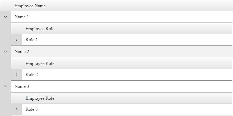 <telerik:RadGrid ID="RadGrid1" runat="server" Width="800px" OnDetailTableDataBind="RadGrid1_DetailTableDataBind" OnNeedDataSource="RadGrid1_NeedDataSource"> <MasterTableView Name="Name" DataKeyNames="ID" AutoGenerateColumns="false"> <Columns> <telerik:GridBoundColumn DataField="Name" HeaderText="Employee Name"></telerik:GridBoundColumn> </Columns> <DetailTables> <telerik:GridTableView Name="Role" DataKeyNames="ID" AutoGenerateColumns="false"> <Columns> <telerik:GridBoundColumn DataField="Role" HeaderText="Employee Role"></telerik:GridBoundColumn> </Columns> <DetailTables> <telerik:GridTableView Name="Designation" DataKeyNames="ID" AutoGenerateColumns="false"> <Columns> <telerik:GridBoundColumn DataField="Designation" HeaderText="Employee Designation"></telerik:GridBoundColumn> </Columns> </telerik:GridTableView> </DetailTables> </telerik:GridTableView> </DetailTables> </MasterTableView> </telerik:RadGrid>