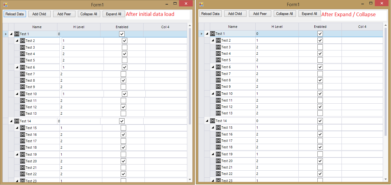 using System;using System.Collections.Generic;using System.ComponentModel;using System.Data;using System.Drawing;using System.Linq;using System.Text;using System.Windows.Forms;using Telerik.WinControls.UI;namespace HierarchyGridExample{ public partial class Form1 : Form { List<MyObject> GridData = new List<MyObject>(); int count = 1; public Form1() { InitializeComponent(); grid.CellValueChanged += grid_CellValueChanged; grid.ColumnWidthChanged += grid_ColumnWidthChanged; grid.ChildViewExpanding += grid_ChildViewExpanding; grid.MultiSelect = true; grid.SelectionMode = GridViewSelectionMode.FullRowSelect; GridViewTemplate level2 = new GridViewTemplate(), level3 = new GridViewTemplate(); CreateTemplate(grid.MasterTemplate); CreateTemplate(level2); CreateTemplate(level3); level2.ShowColumnHeaders = false; level3.ShowColumnHeaders = false; grid.MasterTemplate.Templates.Add(level2); level2.Templates.Add(level3); GridViewRelation rel1 = new GridViewRelation(grid.MasterTemplate, level2); rel1.ChildColumnNames.Add("Children"); grid.Relations.Add(rel1); GridViewRelation rel2 = new GridViewRelation(level2, level3); rel2.ChildColumnNames.Add("Children"); grid.Relations.Add(rel2); /*CreateTemplate(grid.MasterTemplate); GridViewTemplate template = new GridViewTemplate(); CreateTemplate(template); grid.MasterTemplate.Templates.Add(template); template.ShowFilteringRow = false; // Setup child relation GridViewRelation relation = new GridViewRelation(grid.MasterTemplate, template); relation.RelationName = "Children"; relation.ChildColumnNames.Add("TopChildren"); grid.Relations.Add(relation); CreateChildTemplate(template, 0);*/ LoadData(true); grid.MasterTemplate.ExpandAll(); } #region Editing void grid_CellValueChanged(object sender, GridViewCellEventArgs e) { if (e.Column.Name == "Enabled") { (e.Row.DataBoundItem as MyObject).Enabled = (bool)e.Value; } } #endregion Editing #region Formatting private void grid_CellFormatting(object sender, CellFormattingEventArgs e) { if (e.Column.Name == "HLevel") { e.CellElement.Text = e.Row.HierarchyLevel.ToString(); } if (e.Column.Name == "Name") { /*e.CellElement.TextImageRelation = TextImageRelation.ImageBeforeText; e.CellElement.TextAlignment = ContentAlignment.MiddleLeft; e.CellElement.ImageAlignment = ContentAlignment.MiddleLeft; e.CellElement.Image = Properties.Resources.Radio;*/ if (e.Row.HierarchyLevel == 0 && e.Column.Width != 150) { e.Column.Width = 150; e.Column.MaxWidth = 150; e.Column.MinWidth = 150; } else if (e.Column.Width != 131 && e.Row.HierarchyLevel > 0) { e.Column.Width = 131; e.Column.MaxWidth = 131; e.Column.MinWidth = 131; } } else { e.CellElement.Image = null; } } private void grid_ColumnWidthChanged(object sender, ColumnWidthChangedEventArgs e) { if (e.ColumnIndex > 0) { int masterWidth = grid.MasterTemplate.Columns[e.ColumnIndex].Width; int child1Width = grid.MasterTemplate.Templates[0].Columns[e.ColumnIndex].Width; int child2Width = grid.MasterTemplate.Templates[0].Templates[0].Columns[e.ColumnIndex].Width; if (masterWidth != child1Width) { grid.MasterTemplate.Templates[0].Columns[e.ColumnIndex].Width = masterWidth; //grid.MasterTemplate.Templates[0].Refresh(); } if (masterWidth != child2Width) { grid.MasterTemplate.Templates[0].Templates[0].Columns[e.ColumnIndex].Width = masterWidth; //grid.MasterTemplate.Templates[0].Templates[0].Refresh(); } } } #endregion Formatting #region Expand private void grid_ChildViewExpanding(object sender, ChildViewExpandingEventArgs e) { if (!e.IsExpanded && e.ParentRow.ChildRows.Any()) { List<GridViewTemplate> temps = new List<GridViewTemplate>(); if (grid.MasterTemplate.Templates.Any()) { temps.Add(grid.MasterTemplate.Templates[0]); if (grid.MasterTemplate.Templates[0].Templates.Any()) { temps.Add(grid.MasterTemplate.Templates[0].Templates[0]); } } for (int x = 1; x < grid.MasterTemplate.Columns.Count; x++) { temps.ForEach(c => c.Columns[x].Width = grid.MasterTemplate.Columns[x].Width); } } } private void RestoreExpanded(GridViewRowInfo g, HashSet<object> expanded) { using (grid.DeferRefresh()) { if (g == null) { foreach (var item in this.grid.Rows) { if (expanded.Contains(item.DataBoundItem)) { item.IsExpanded = true; } foreach (var child in item.ChildRows) { RestoreExpanded(child, expanded); } } } else { if (expanded.Contains(g.DataBoundItem)) { g.IsExpanded = true; } foreach (var child in g.ChildRows) { RestoreExpanded(child, expanded); } } } } private void SaveExpanded(GridViewRowInfo g, HashSet<object> items) { if (g == null) { foreach (var item in this.grid.Rows) { if (item.IsExpanded) { items.Add(item.DataBoundItem); } foreach (var child in item.ChildRows) { SaveExpanded(child, items); } } } else { if (g.IsExpanded) { items.Add(g.DataBoundItem); } foreach (var child in g.ChildRows) { SaveExpanded(child, items); } } } #endregion Expand #region Data private void LoadData(bool createTestData = false) { using (grid.DeferRefresh()) { HashSet<object> expanded = new HashSet<object>(); SaveExpanded(null, expanded); grid.DataSource = null; if (createTestData) { GridData = new List<MyObject>(); MyObject m1 = new MyObject("Test " + count); count++; LoadChild(m1, 3); GridData.Add(m1); MyObject m2 = new MyObject("Test " + count); count++; LoadChild(m2, 3); GridData.Add(m2); MyObject m3 = new MyObject("Test " + count); count++; LoadChild(m3, 3); GridData.Add(m3); } grid.DataSource = GridData; RestoreExpanded(null, expanded); } } private void LoadChild(MyObject parent, int number, int level = 0) { level++; for (int i = 0; i < number; i++) { MyObject m2 = new MyObject("Test " + count, count % 2 == 0); count++; parent.Children.Add(m2); m2.Parent = parent; if (level < 2) { LoadChild(m2, number, level); } } } private void CreateChild(MyObject parent = null) { if (parent != null) { MyObject m2 = new MyObject("Test " + count, count % 2 == 0); count++; parent.Children.Add(m2); m2.Parent = parent; //parent.Children.ResetBindings(); } else { MyObject m2 = new MyObject("Test " + count, count % 2 == 0); count++; GridData.Add(m