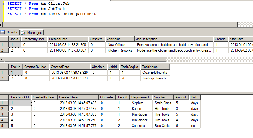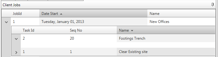 <%-- CLIENT JOBS HIERARCHICAL GRIDS --%> <telerik:RadSlidingPane ID="rspClientJobs" Title="Client Jobs" runat="server" Height="650px"> <telerik:RadFormDecorator ID="QsfFromDecorator" runat="server" DecoratedControls="All" EnableRoundedCorners="false" /> <telerik:RadAjaxManager ID="RadAjaxManager1" runat="server"> <AjaxSettings> <telerik:AjaxSetting AjaxControlID="grdClientJobs"> <UpdatedControls> <telerik:AjaxUpdatedControl ControlID="grdClientJobs"></telerik:AjaxUpdatedControl> </UpdatedControls> </telerik:AjaxSetting> </AjaxSettings> </telerik:RadAjaxManager> <telerik:RadGrid ID="grdClientJobs" OnPreRender="grdClientJobs_PreRender" ShowStatusBar="True" DataSourceID="SqlTopLevel_Clients" runat="server" AutoGenerateColumns="False" PageSize="7" AllowSorting="True" AllowPaging="True" GridLines="None" CellSpacing="0"> <PagerStyle Mode="NumericPages"></PagerStyle> <MasterTableView DataSourceID="SqlTopLevel_Clients" DataKeyNames="JobId" AllowMultiColumnSorting="True" HierarchyLoadMode="Client" Width="100%"> <DetailTables> <telerik:GridTableView DataKeyNames="JobId" DataSourceID="SqlLevel2_ClientJobs" Width="100%" runat="server"> <ParentTableRelation> <telerik:GridRelationFields DetailKeyField="JobId" MasterKeyField="JobId"> </telerik:GridRelationFields> </ParentTableRelation> <%--LEVEL 3 GRID TABLE - JOBTASKS COLUMNS--%> <DetailTables> <telerik:GridTableView DataKeyNames="TaskId" DataSourceID="SqlLevel3_ClientJobTasks" Width="100%" runat="server"> <ParentTableRelation> <telerik:GridRelationFields DetailKeyField="TaskId" MasterKeyField="TaskId"></telerik:GridRelationFields> </ParentTableRelation> <Columns> <telerik:GridBoundColumn SortExpression="Requirement" HeaderText="Requirement" HeaderButtonType="TextButton" DataField="Requirement" UniqueName="Requirement"> </telerik:GridBoundColumn> <telerik:GridBoundColumn SortExpression="Supplier" HeaderText="Supplier" HeaderButtonType="TextButton" DataField="Supplier" UniqueName="Supplier"> </telerik:GridBoundColumn> <telerik:GridBoundColumn SortExpression="Amount" HeaderText="Amount" HeaderButtonType="TextButton" DataField="Amount" UniqueName="Amount"> </telerik:GridBoundColumn> <telerik:GridBoundColumn SortExpression="Units" HeaderText="Units" HeaderButtonType="TextButton" DataField="Units" UniqueName="Units"> </telerik:GridBoundColumn> </Columns> <SortExpressions> <telerik:GridSortExpression FieldName="TaskName" SortOrder="Descending"></telerik:GridSortExpression> </SortExpressions> </telerik:GridTableView> </DetailTables> <%--LEVEL 2 GRID TABLE - CLIENT JOB COLUMNS--%> <Columns> <telerik:GridBoundColumn SortExpression="TaskId" HeaderText="Task Id" HeaderButtonType="TextButton" DataField="TaskId" UniqueName="TaskId"> </telerik:GridBoundColumn> <telerik:GridBoundColumn SortExpression="TaskSeqNo" HeaderText="Seq No" HeaderButtonType="TextButton" DataField="TaskSeqNo" UniqueName="TaskSeqNo"> </telerik:GridBoundColumn> <telerik:GridBoundColumn SortExpression="TaskName" HeaderText="Name" HeaderButtonType="TextButton" DataField="TaskName" UniqueName="TaskName"> </telerik:GridBoundColumn> </Columns> <SortExpressions> <telerik:GridSortExpression FieldName="TaskName" SortOrder="Descending"></telerik:GridSortExpression> </SortExpressions> </telerik:GridTableView> </DetailTables> <%--TOP LEVEL CLIENT COLUMNS--%> <Columns> <telerik:GridBoundColumn SortExpression="JobId" HeaderText="JobId" HeaderButtonType="TextButton" DataField="JobId" UniqueName="JobId"> </telerik:GridBoundColumn> <telerik:GridBoundColumn SortExpression="StartDate" HeaderText="Date Start" HeaderButtonType="TextButton" DataField="StartDate" UniqueName="StartDate" DataFormatString="{0:D}"> </telerik:GridBoundColumn> <telerik:GridBoundColumn SortExpression="JobName" HeaderText="Name" HeaderButtonType="TextButton" DataField="JobName" UniqueName="JobName"> </telerik:GridBoundColumn> </Columns> </MasterTableView> </telerik:RadGrid> <%--HIERARCHICAL GRIDS SQL DATA SOURCES--%> <asp:SqlDataSource ID="SqlTopLevel_Clients" ConnectionString="<%$ ConnectionStrings:SiteSqlServer %>" ProviderName="System.Data.SqlClient" SelectCommand="SELECT * FROM bm_ClientJob Where ClientId = @ClientId" runat="server"> </asp:SqlDataSource> <asp:SqlDataSource ID="SqlLevel2_ClientJobs" ConnectionString="<%$ ConnectionStrings:SiteSqlServer %>" ProviderName="System.Data.SqlClient" SelectCommand="SELECT * FROM bm_JobTask where JobId = @JobId Order By TaskSeqNo" runat="server"> <SelectParameters> <asp:SessionParameter Name="JobId" SessionField="JobId" Type="Int32"></asp:SessionParameter> </SelectParameters> </asp:SqlDataSource> <asp:SqlDataSource ID="SqlLevel3_ClientJobTasks" ConnectionString="<%$ ConnectionStrings:SiteSqlServer %>" ProviderName="System.Data.SqlClient" SelectCommand="SELECT * FROM bm_TaskStockRequirement where TaskId = @TaskId" runat="server"> <SelectParameters> <asp:SessionParameter Name="TaskId" SessionField="TaskId" Type="Int32"></asp:SessionParameter> </SelectParameters> </asp:SqlDataSource>