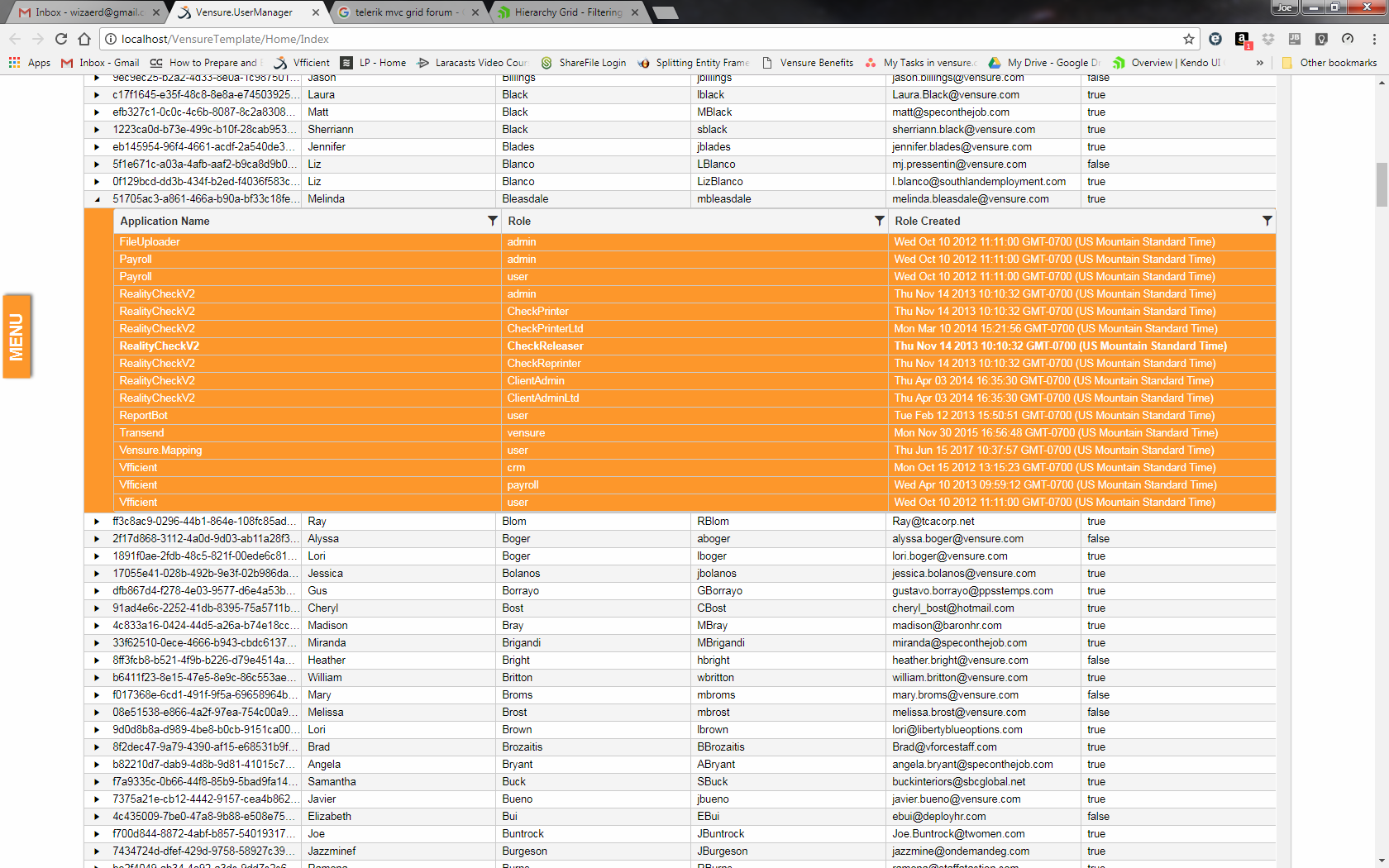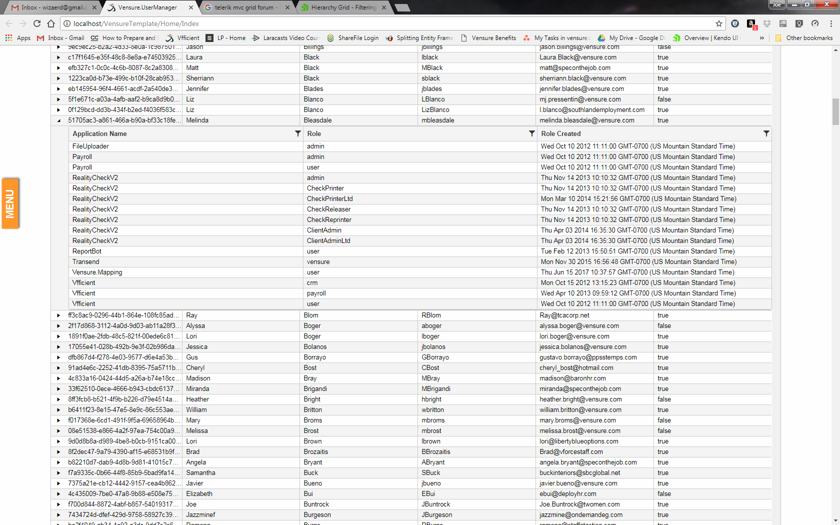 @using System.Configuration@using Vensure.Dashboard.DataEntity@{ ViewBag.Title = "Index";}<style> .k-loading-image { @* this can't be setup in the GridOverrides.css because of the MVC path resolver *@ background-image: url(@Url.Content("~/Content/loadBgGrey.gif")); } .k-button .k-icon { color: white; }</style>@(Html.Kendo().Grid<User>() .Name("userGrid") .Columns(cols => { cols.Bound(c => c.UserId).Filterable(false); cols.Bound(c => c.FirstName); cols.Bound(c => c.LastName); cols.Bound(c => c.UserName); cols.Bound(c => c.Email); cols.Bound(c => c.IsActive); }) .ClientDetailTemplateId("template") .Resizable(resize => resize.Columns(true)) .Scrollable(s => s.Height("auto")) .Sortable() .Pageable(pageable => pageable .Refresh(true) .PageSizes(new List<object> { 10, 20, 30, 40, 50, "all" }) .Refresh(true) .ButtonCount(10) ) .Filterable(f => f.Enabled(true)) .AutoBind(true) .Events(events => events.DataBound("dataBound")) .DataSource(dataSource => dataSource .Ajax() .Read(r => r.Action("GetAllUsers", "Home").Type(HttpVerbs.Get)) .PageSize(20) ))<script id="template" type="text/kendo-tmpl"> @(Html.Kendo().Grid<UserAppRoles>() .Name("grid_#=UserName") .Columns(cols => { cols.Bound(c => c.ApplicationName); cols.Bound(c => c.Role); cols.Bound(c => c.RoleCreated); }) .DataSource(ds => ds .Ajax() .PageSize(10) .Read(r => r.Action("GetUserRoles", "Home", new { userName = "#=UserName" }).Type(HttpVerbs.Post)) ) .Pageable() .Sortable() .ToClientTemplate())</script><script type="text/javascript"> $(document).ready(function () { $("#gridFilterReset").click(function (e) { e.preventDefault(); var ds = $("#userGrid").data("kendoGrid").dataSource; ds.filter([]); }); //$("#gridSaveSettings").click(function (e) { // e.preventDefault(); // localStorage["gridSettings"] = window.kendo.stringify($("#ajaxGrid").data("kendoGrid").getOptions()); //}); }); function dataBound() { this.expandRow(this.tbody.find("tr.k-master-row").first()); }</script>