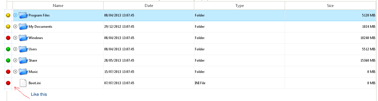 If I understand correctly, you want to insert a column before the expander element in RadGridView. If so, this would not be possible. However, if you can use the row header column cells for some kind of indication as you have demonstrates on the attached image. To do that you would have to use the ViewCellFormatting event of RadGridView: