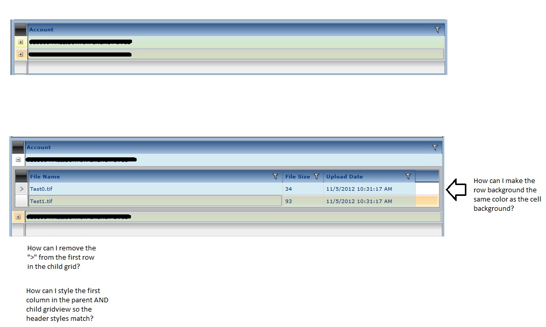 How can I change the first column of both the parent and child so the header is not black but matches the other columns header styles? How can I remove the ">" from the first row of the child gridview for each row in the table?