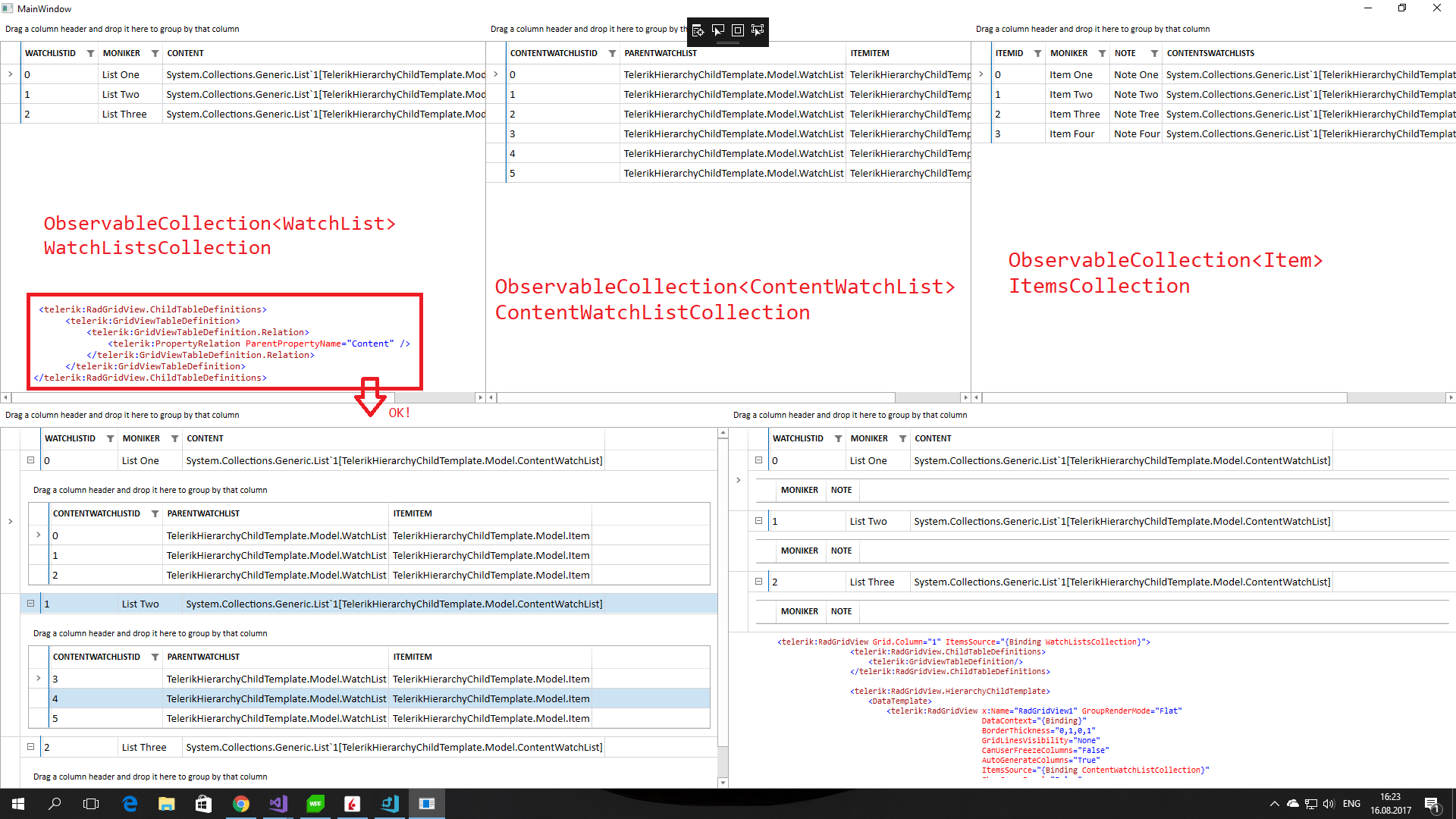 <Window x:Class="TelerikHierarchyChildTemplate.MainWindow" xmlns:telerik="http://schemas.telerik.com/2008/xaml/presentation" Title="MainWindow" Height="350" Width="525"> <Grid> <Grid.RowDefinitions> <RowDefinition Height="*"/> <RowDefinition Height="*"/> </Grid.RowDefinitions> <Grid Grid.Row="0"> <Grid.ColumnDefinitions> <ColumnDefinition Width="*"/> <ColumnDefinition Width="*"/> <ColumnDefinition Width="*"/> </Grid.ColumnDefinitions> <telerik:RadGridView Grid.Column="0" ItemsSource="{Binding WatchListsCollection}"></telerik:RadGridView> <telerik:RadGridView Grid.Column="1" ItemsSource="{Binding ContentWatchListCollection}"></telerik:RadGridView> <telerik:RadGridView Grid.Column="2" ItemsSource="{Binding ItemsCollection}"></telerik:RadGridView> </Grid> <Grid Grid.Row="1"> <Grid.ColumnDefinitions> <ColumnDefinition Width="*"/> <ColumnDefinition Width="*"/> </Grid.ColumnDefinitions> <telerik:RadGridView ItemsSource="{Binding WatchListsCollection}"> <telerik:RadGridView.ChildTableDefinitions> <telerik:GridViewTableDefinition> <telerik:GridViewTableDefinition.Relation> <telerik:PropertyRelation ParentPropertyName="Content" /> </telerik:GridViewTableDefinition.Relation> </telerik:GridViewTableDefinition> </telerik:RadGridView.ChildTableDefinitions> </telerik:RadGridView> <telerik:RadGridView Grid.Column="1" ItemsSource="{Binding WatchListsCollection}"> <telerik:RadGridView.ChildTableDefinitions> <telerik:GridViewTableDefinition/> </telerik:RadGridView.ChildTableDefinitions> <telerik:RadGridView.HierarchyChildTemplate> <DataTemplate> <telerik:RadGridView x:Name="RadGridView1" GroupRenderMode="Flat" DataContext="{Binding}" BorderThickness="0,1,0,1" GridLinesVisibility="None" CanUserFreezeColumns="False" AutoGenerateColumns="False" ItemsSource="{Binding ContentWatchListCollection}" ShowGroupPanel="False" IsReadOnly="True"> <telerik:RadGridView.Columns> <telerik:GridViewDataColumn DataMemberBinding="{Binding ItemItem.Moniker}" Header="Moniker" /> <telerik:GridViewDataColumn DataMemberBinding="{Binding ItemItem.Note}" Header="Note" /> </telerik:RadGridView.Columns> </telerik:RadGridView> </DataTemplate> </telerik:RadGridView.HierarchyChildTemplate> </telerik:RadGridView> </Grid> </Grid></Window>