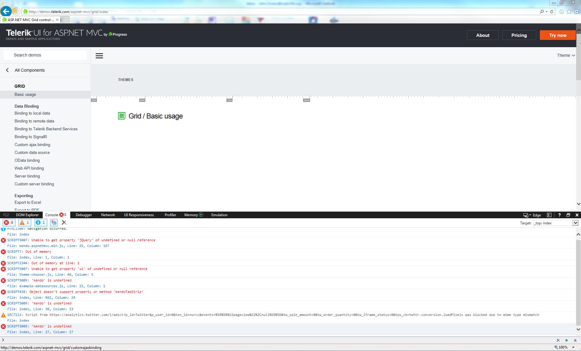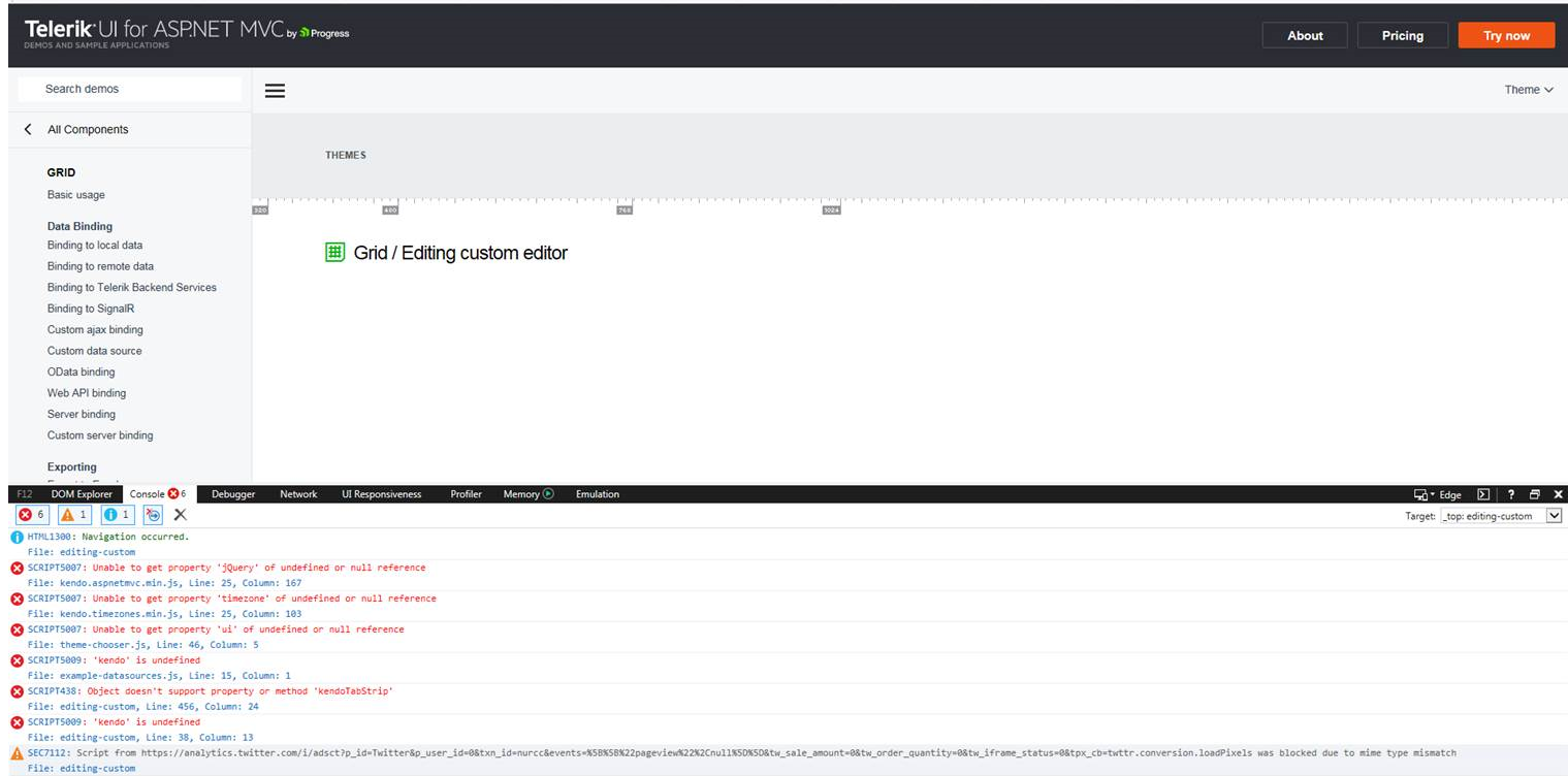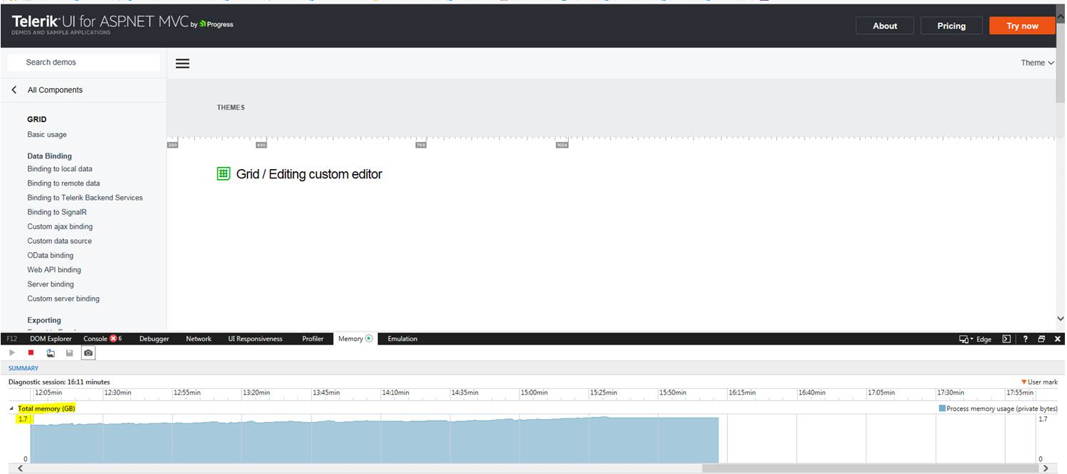 Hi, we are having memory issues with many of our projects that use kendo.all.min.js. We had tried many of the suggestions in your documentation to no avail. Then we tried to make one of your demo's fail, and it fails exactly like our applications. We would appreciate your suggestions to fix this. I have attached a screen shots of the demo failing. http://demos.telerik.com/aspnet-mvc/grid/editing-custom