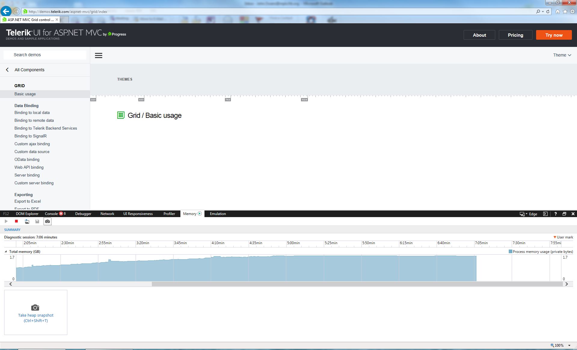 I'm able to reproduce the issue with multiple demos, including this one - http://demos.telerik.com/aspnet-mvc/grid/index. The fastest way I've found to create the issue is to keep clicking on the link for the basic usage grid (in the menu on the left) and IE memory usage climbs to around 1.6 GB before the page fails. Alternately, I can repeatedly click refresh (F5) to keep loading the page to get the same result. It takes me 3 - 5 minutes (around 30 page loads) to cause the error. I'm using IE version 11.0.9600.18449 (update version 11.0.35) running on 64-bit Windows 7 Enterprise. I can also reproduce the issues at home on a personal computer using a more recent version of IE 11. Any suggestions or workarounds would be greatly appreciated.