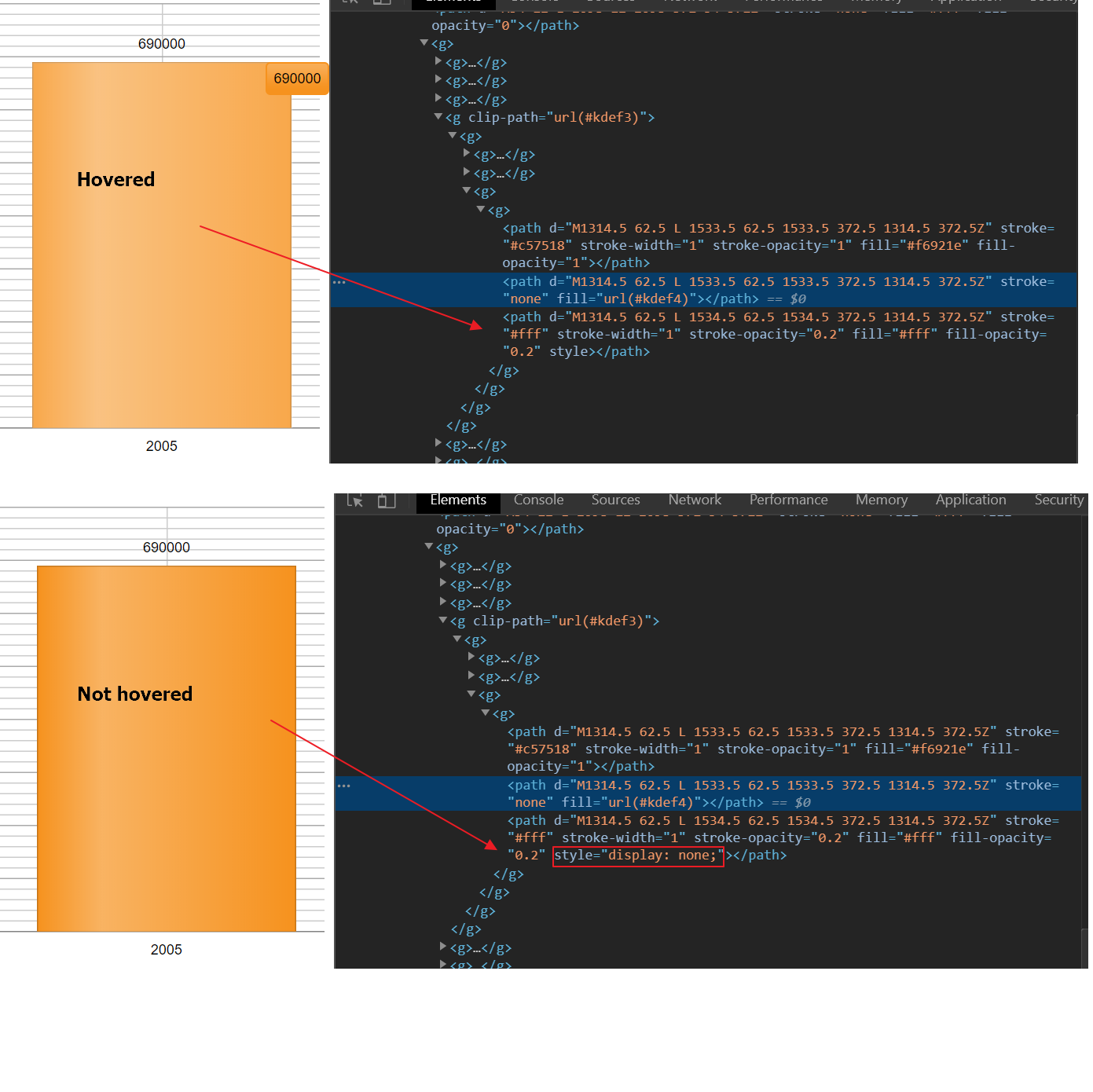 This is the inline style="display: none;" style which hides the path element when the bar is not hovered: