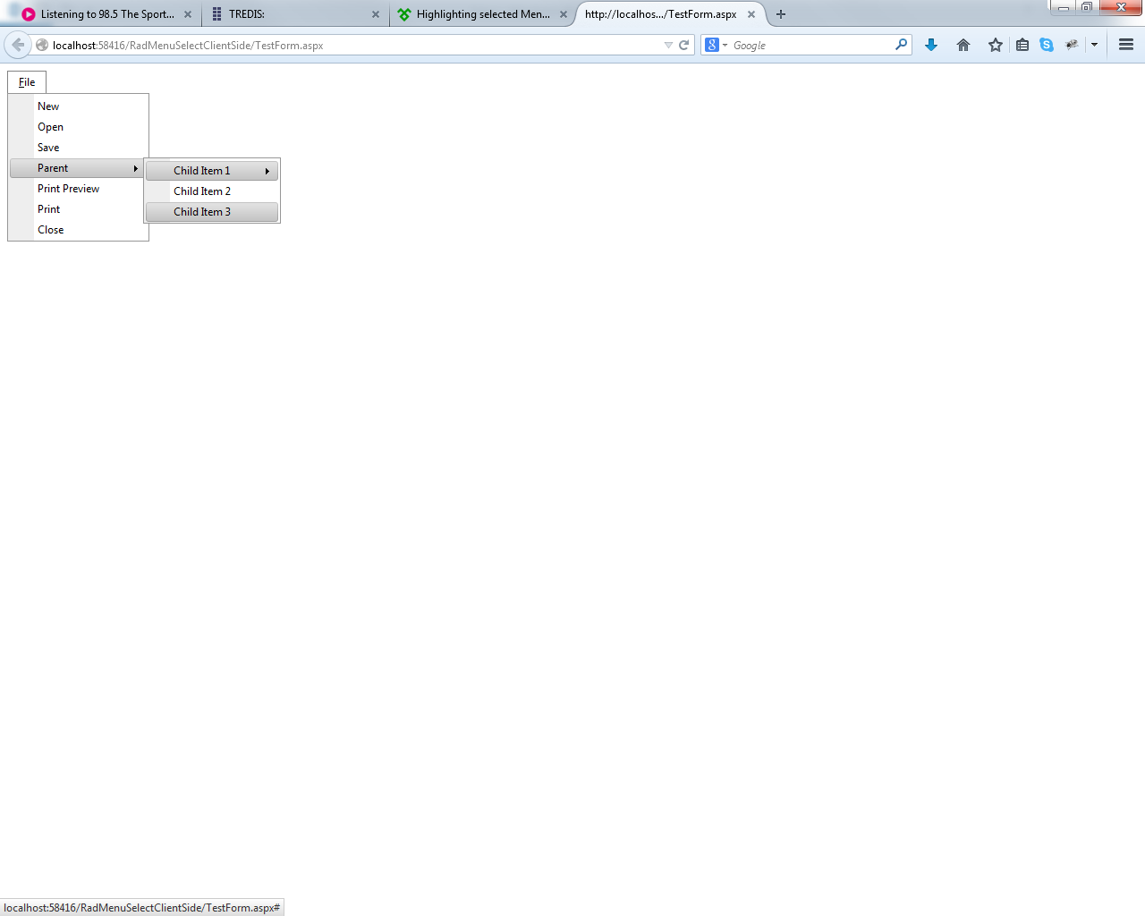 <script type="text/javascript"> function OnClientItemClicking(sender, args) { var item = args.get_item(); $telerik.$(".rmFocused").removeClass("rmFocused"); item.set_selected(true); }</script><telerik:RadMenu ID="RadMenu2" runat="server" Flow="Vertical" Width="200" OnClientItemClicking="OnClientItemClicking"> <Items> <telerik:RadMenuItem Text="Save As" > <Items> <telerik:RadMenuItem Text="Word Document" /> <telerik:RadMenuItem Text="Word Template" /> <telerik:RadMenuItem Text="Adobe PDF" /> <telerik:RadMenuItem Text="Other formats"> <Items> <telerik:RadMenuItem Text="PDF"></telerik:RadMenuItem> </Items> </telerik:RadMenuItem> </Items> </telerik:RadMenuItem> <telerik:RadMenuItem Text="Print"> <Items> <telerik:RadMenuItem Text="Print" /> <telerik:RadMenuItem Text="Quick Print" /> <telerik:RadMenuItem Text="Print Preview" /> </Items> </telerik:RadMenuItem> </Items></telerik:RadMenu>protected void Page_Load(object sender, EventArgs e) { if (!Page.IsPostBack) { RadMenu2.FindItemByText("PDF").HighlightPath(); } }Regards,
