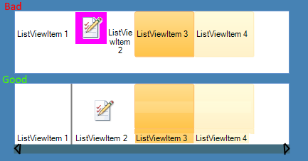 var element = radListView1.ListViewElement.ViewElement as IconListViewElement;element.Orientation = Orientation.Horizontal;var image = Image.FromFile(@"C:\img\delete.png");for (int i = 0; i < 20; i++){ var item = new ListViewDataItem("Item " + i); item.Image = image; item.ImageAlignment = ContentAlignment.TopCenter; item.TextAlignment = ContentAlignment.BottomCenter; item.TextImageRelation = TextImageRelation.ImageAboveText; radListView1.Items.Add(item);}I hope this will be useful. Let me know if you have additional questions.