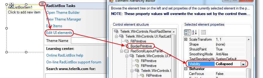 Thanks for getting back to me. If you would like to remove the border of RadListBox control, you can achieve that by using Edit UI Elements action from the Smart Tag of the control. This link (action) opens a modal window that has a Tree View control on the left and a Property Grid on the right. The Tree View represents the Element Hierarchy of RadListBox. In the Tree View select the BorderPrimitive node and in the Property Grid on the right set its Visibility property to Collapsed.