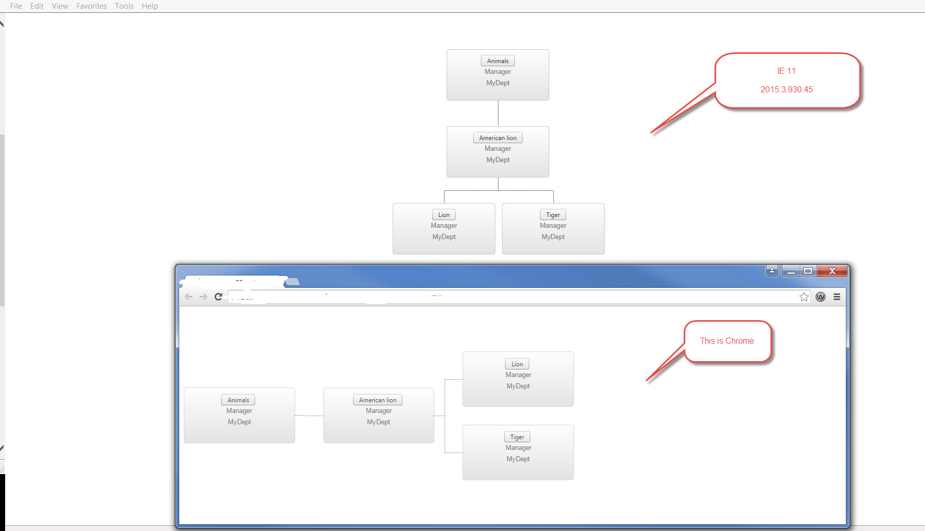 Attached you will find runnable web site testing the orientation issue with the OrgChart. Could you please run it at your side without changing the Web.config? If the problem is still present, could you record a video, running the web site and send it to us? It is also good to know which is the version of IE 11 you are testing on.