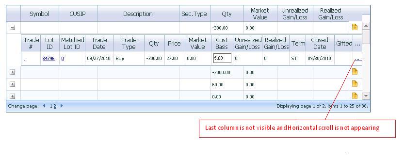 <telerik:RadGrid ID="rgCostBasisInquiry" runat="server" AllowMultiRowSelection="false" AllowPaging="true" OnPreRender="rgCostBasisInquiry_PreRender" ShowHeader="true" AutoGenerateColumns="False" loadingtemplatetransparency="25" OnNeedDataSource="rgCostBasisInquiry_NeedDataSource" Width="750px" OnItemDataBound="rgCostBasisInquiry_ItemDataBound" OnDetailTableDataBind="rgCostBasisInquiry_DetailTableDataBind" GridLines="None" AllowSorting="True" Height="220px" AlternatingItemStyle-BackColor="AliceBlue" Skin="Office2007"> <AlternatingItemStyle BackColor="AliceBlue"></AlternatingItemStyle> <MasterTableView TableLayout="Fixed" Name="CBInquiryGrid" DataKeyNames="SecurityMasterID" EnableNoRecordsTemplate="true" > <PagerStyle Mode="NextPrevAndNumeric" Visible="true" /> <NoRecordsTemplate> <div>No records to display</div> </NoRecordsTemplate> <ParentTableRelation> <telerik:GridRelationFields DetailKeyField="SecurityMasterID" MasterKeyField="SecurityMasterID" /> </ParentTableRelation> <DetailTables> <telerik:GridTableView AllowPaging="false" Name="gtvCBInquiryChildGrid" runat="server" ShowHeader="true" Width="100%" > <RowIndicatorColumn> <HeaderStyle Width="5px"></HeaderStyle> </RowIndicatorColumn> <ExpandCollapseColumn> <HeaderStyle Width="5px"></HeaderStyle> </ExpandCollapseColumn> <Columns> <telerik:GridTemplateColumn DataField="SecurityMasterID" HeaderButtonType="TextButton" HeaderText="SecurityMasterID" SortExpression="SecurityMasterID" UniqueName="SecurityMasterID" Visible="false"> <HeaderStyle HorizontalAlign="left" Width="0px" /> <ItemStyle HorizontalAlign="left" /> <ItemTemplate> <asp:Label runat="server" ID="lblSecurityMasterID" Text='<%# DataBinder.Eval(Container.DataItem, "SecurityMasterID")%>'></asp:Label> </ItemTemplate> </telerik:GridTemplateColumn> <telerik:GridTemplateColumn DataField="ParentLotID" HeaderButtonType="TextButton" HeaderText="ParentLotID" SortExpression="ParentLotID" UniqueName="ParentLotID" Visible="false"> <HeaderStyle HorizontalAlign="left" /> <ItemStyle HorizontalAlign="left" /> <ItemTemplate> <asp:Label runat="server" ID="lblParentLotID" Text='<%# Convert.ToInt64(DataBinder.Eval(Container.DataItem, "ParentLotID"))%>'></asp:Label> </ItemTemplate> </telerik:GridTemplateColumn> <telerik:GridTemplateColumn DataField="TradeNumber" HeaderButtonType="TextButton" HeaderText="Trade #" SortExpression="TradeNumber" UniqueName="TradeNumber" > <HeaderStyle HorizontalAlign="center" Width="30px" /> <ItemStyle HorizontalAlign="left" /> <ItemTemplate> <asp:LinkButton ID="hlTradeNumber" Font-Underline="true" ForeColor="Blue" ToolTip="Click here to view Cost Basis Detail screen" runat="server" Text='<%# ((DataBinder.Eval(Container.DataItem, "TradeNumber") == null) || (DataBinder.Eval(Container.DataItem, "TradeNumber") == "")) ? " " : DataBinder.Eval(Container.DataItem, "TradeNumber")%>'></asp:LinkButton> </ItemTemplate> </telerik:GridTemplateColumn> <telerik:GridTemplateColumn DataField="TaxLotID" HeaderButtonType="TextButton" HeaderText="Lot ID" SortExpression="TaxLotID" UniqueName="TaxLotID"> <HeaderStyle HorizontalAlign="center" Width="30px" /> <ItemStyle HorizontalAlign="left" /> <ItemTemplate> <asp:LinkButton ID="hlLotID" Font-Underline="true" ForeColor="Blue" ToolTip="Click here to view Cost Basis Detail screen" runat="server" Text='<%#Convert.ToInt64(DataBinder.Eval(Container.DataItem, "TaxLotID")) %>'></asp:LinkButton> </ItemTemplate> </telerik:GridTemplateColumn> <telerik:GridTemplateColumn DataField="MatchedLotID" HeaderButtonType="TextButton" HeaderText="Matched Lot ID" SortExpression="MatchedLotID" UniqueName="MatchedLotID"> <HeaderStyle HorizontalAlign="center" Width="44px" /> <ItemStyle HorizontalAlign="left" /> <ItemTemplate> <asp:LinkButton ID="hlMatchedLotID" Font-Underline="true" ForeColor="Blue" ToolTip="Click here to view Cost Basis Detail screen" runat="server" Text='<%#Convert.ToInt64(DataBinder.Eval(Container.DataItem, "MatchedLotID")) %>'></asp:LinkButton> </ItemTemplate> </telerik:GridTemplateColumn> <telerik:GridBoundColumn DataField="TradeDate" HeaderButtonType="TextButton" HeaderText="Trade Date" SortExpression="TradeDate" UniqueName="TradeDate"> <HeaderStyle HorizontalAlign="center" Width="50px" /> <ItemStyle HorizontalAlign="left" /> </telerik:GridBoundColumn> <telerik:GridTemplateColumn DataField="TradeType" HeaderButtonType="TextButton" HeaderText="Trade Type" SortExpression="TradeType" UniqueName="TradeType" > <HeaderStyle HorizontalAlign="center" Width="54px" /> <ItemStyle HorizontalAlign="left" /> <ItemTemplate> <asp:Label runat="server" ID="lblTradeType" Text='<%# DataBinder.Eval(Container.DataItem, "TradeType")%>'></asp:Label> </ItemTemplate> </telerik:GridTemplateColumn> <telerik:GridBoundColumn DataField="Quantity" HeaderButtonType="TextButton" HeaderText="Qty" SortExpression="Quantity" UniqueName="Quantity"> <HeaderStyle HorizontalAlign="center" Width="33px" /> <ItemStyle HorizontalAlign="left" /> </telerik:GridBoundColumn> <telerik:GridBoundColumn DataField="Price" HeaderButtonType="TextButton" HeaderText="Price" SortExpression="Price" UniqueName="Price"> <HeaderStyle HorizontalAlign="center" Width="33px" /> <ItemStyle HorizontalAlign="left" /> </telerik:GridBoundColumn> <telerik:GridBoundColumn DataField="MarketValue" HeaderButtonType="TextButton" HeaderText="Market Value" SortExpression="MarketValue" UniqueName="MarketValueChld"> <HeaderStyle HorizontalAlign="center" Width="45px" /> <ItemStyle HorizontalAlign="left" /> </telerik:GridBoundColumn> <telerik:GridTemplateColumn DataField="CostBasis" HeaderButtonType="TextButton" HeaderText="Cost Basis" SortExpression="" UniqueName="CostBasis"> <HeaderStyle HorizontalAlign="center" Width="36px" /> <ItemStyle HorizontalAlign="left" /> <ItemTemplate> <telerik:RadNumericTextBox ID="txtCostBasis" Font-Size="xx-small" runat="server" Width="95%" Value='<%# Convert.ToDecimal(DataBinder.Eval(Container.DataItem, "CostBasis"))%>'> </telerik:RadNumericTextBox> <asp:HiddenField ID="hdnCostBasisChldHdnChanged