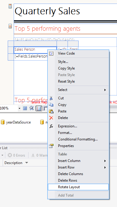 The Crosstab/Table/List item has Rotate Layout option available through its context menu. The feature reverses rows and columns and thus the item grows horizontally.