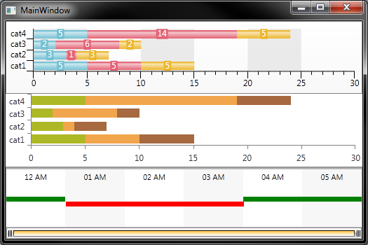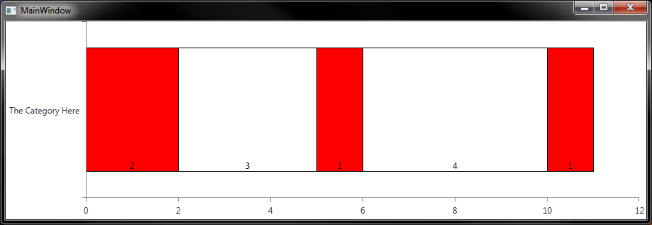 <telerik:RadChart x:Name="timeLineChart" ItemsSource="{Binding TimeLineChart, Mode=TwoWay}"> <telerik:RadChart.DefaultView> <telerik:ChartDefaultView> <telerik:ChartDefaultView.ChartLegend> <telerik:ChartLegend Visibility="Collapsed" /> </telerik:ChartDefaultView.ChartLegend> </telerik:ChartDefaultView> </telerik:RadChart.DefaultView> <telerik:RadChart.SeriesMappings> <telerik:SeriesMapping> <telerik:SeriesMapping.SeriesDefinition> <telerik:HorizontalStackedBarSeriesDefinition ></telerik:HorizontalStackedBarSeriesDefinition> </telerik:SeriesMapping.SeriesDefinition> <telerik:SeriesMapping.ItemMappings> <telerik:ItemMapping DataPointMember="Label" FieldName="Value"></telerik:ItemMapping> <telerik:ItemMapping DataPointMember="YValue" FieldName="Value"></telerik:ItemMapping> <telerik:ItemMapping DataPointMember="XCategory" FieldName="Label"/> </telerik:SeriesMapping.ItemMappings> </telerik:SeriesMapping> </telerik:RadChart.SeriesMappings> </telerik:RadChart>