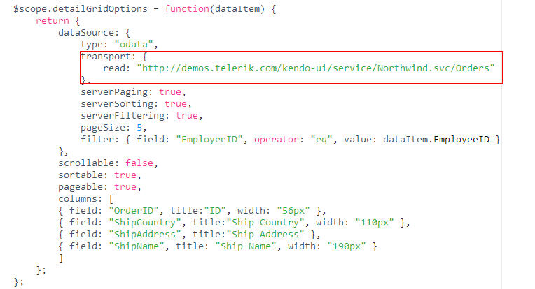 01.$scope.getMessageQueueKendo = function () {02. var v = 'test';03. $scope.gridOptions = {04. columns: [05. { field: "Id" },06. { field: "Data_Contract_Field_1" },07. { field: "Data_Contract_Field_2" },08. { field: "Data_Contract_Field_3" },09. { field: "Data_Contract_Field_4" },10. { field: "Data_Contract_Field_5" }11. ],12. dataSource: {13. schema: {14. data: "d"15. },16. 17. transport: {18. read: function (e) {19. service.getData(0, -1).success(function (data, status, headers, config) {20. e.success(data);21. }).22. error(function (data, status, headers, config) {23. alert('error');24. console.log('Error getting message queue. Server returned status : ', status);25. console.log(data);26. });27. }28. }29. },30. pageSize: 531. }32.};