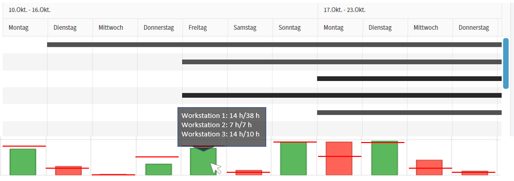 I would like to use the Gantt chart for industrial production planning. Independently of the bars, a color highlighting of individual columns (see picture) is to be inserted based on the personnel situation in available employee hours (e.g. workstation 2: 7h/...) and the workload according to the work plan ( workstation 2: .../7h). In addition, a mouse-over on the capacity situation is to be shown per day.