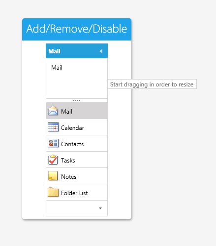 Hi Tomas, You can disable the resizer by setting the IsVerticalResizerVisible property of the OutlookBar to False.