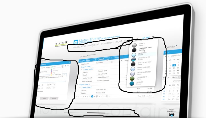 i've recently decided to chose one of 3rd party components to use in my wpf applications...when i came to this site i saw this image,i loved it's design...but in trial i couldn't find controls or samples about how can i do something like that...can any one help me in a little guide about how can i achieve a design like that? (Specially the parts i've pointed on...what kind of control are they)