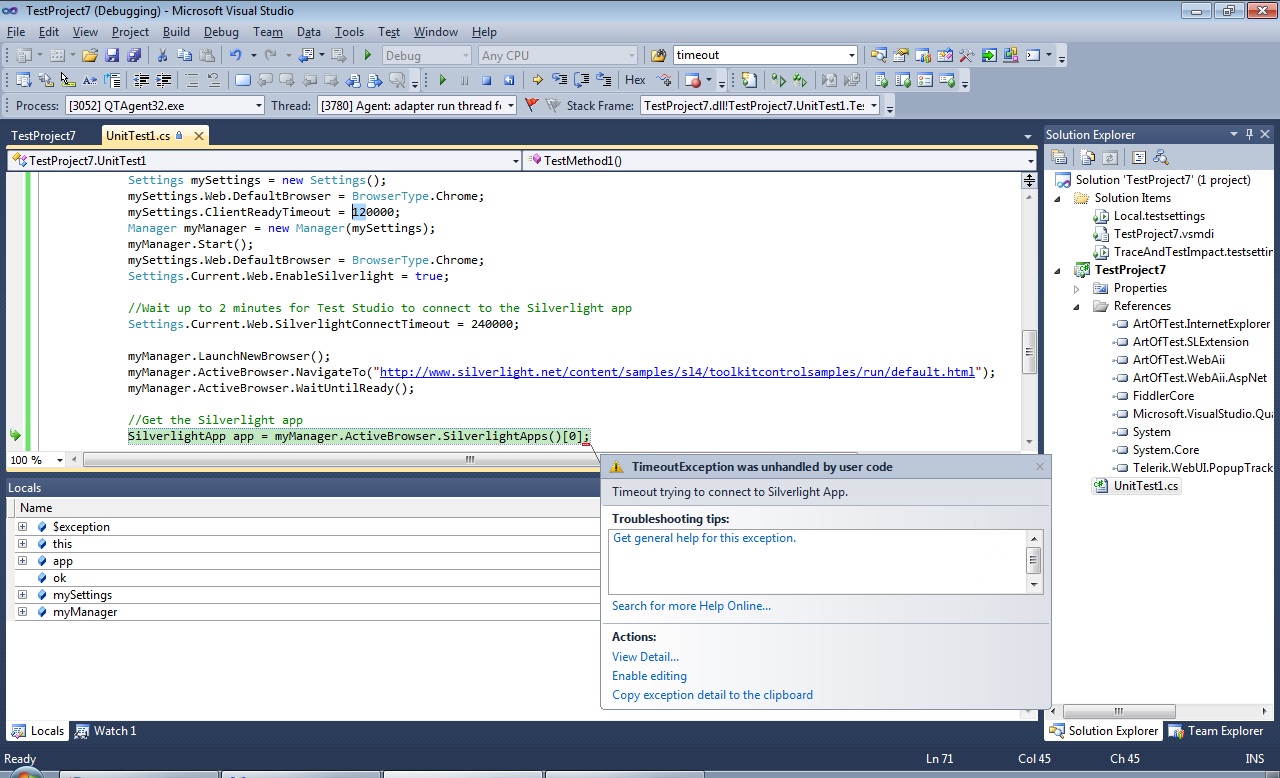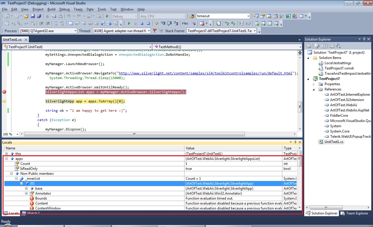 } private TestContext testContextInstance; public TestContext TestContext { get { return testContextInstance; } set { testContextInstance = value; } } [TestMethod] public void TestMethod1() { Settings mySettings = new Settings(); mySettings.Web.DefaultBrowser = BrowserType.Chrome; mySettings.ClientReadyTimeout = 120000; Manager myManager = new Manager(mySettings); //must start myManager after creating it myManager.Start(); try { Settings.Current.Web.EnableSilverlight = true; mySettings.UnexpectedDialogAction = UnexpectedDialogAction.DoNotHandle; myManager.LaunchNewBrowser(); myManager.ActiveBrowser.NavigateTo("http://www.silverlight.net/content/samples/sl4/toolkitcontrolsamples/run/default.html"); myManager.ActiveBrowser.WaitUntilReady(); SilverlightAppsList apps = myManager.ActiveBrowser.SilverlightApps(); SilverlightApp app = apps.ToArray()[0]; string ok = "I am glad if this is executed :)"; } catch (Exception e) { myManager.Dispose(); } } }}
