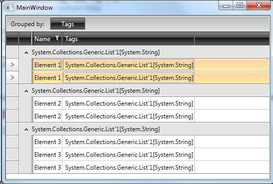 public class myObject { public String Name { get; set; } public List<String> Tags{get;set;} }public class ViewModelMainWindow:ViewModel { System.ComponentModel.ICollectionView m_myListOfObject; public ICollectionView MyListOfObject { get { return m_myListOfObject; } set { m_myListOfObject = value; } } }public partial class App : Application { MainWindow m_ViewMainWindow; ViewModelMainWindow m_ViewModelMainWindows; List<myObject> m_myListOfObject; protected override void OnStartup(StartupEventArgs e) { Init(); m_ViewMainWindow.Show(); } void Init() { m_ViewMainWindow = new MainWindow(); m_ViewModelMainWindows = new ViewModelMainWindow(); PropertyGroupDescription groupDescriptionPorte = new PropertyGroupDescription("Tags"); m_myListOfObject = new List<myObject>(); m_myListOfObject.Add(new myObject()); m_myListOfObject.Last().Name = "Element 1"; m_myListOfObject.Last().Tags = new List<string>(); m_myListOfObject.Last().Tags.Add("Tag 1"); m_myListOfObject.Last().Tags.Add("Tag 2"); m_myListOfObject.Add(new myObject()); m_myListOfObject.Last().Name = "Element 2"; m_myListOfObject.Last().Tags = new List<string>(); m_myListOfObject.Last().Tags.Add("Tag 1"); m_myListOfObject.Last().Tags.Add("Tag 3"); m_myListOfObject.Add(new myObject()); m_myListOfObject.Last().Name = "Element 3"; m_myListOfObject.Last().Tags = new List<string>(); m_myListOfObject.Last().Tags.Add("Tag 2"); m_myListOfObject.Last().Tags.Add("Tag 4"); m_ViewModelMainWindows.MyListOfObject = CollectionViewSource.GetDefaultView(m_myListOfObject); m_ViewModelMainWindows.MyListOfObject.GroupDescriptions.Add(groupDescriptionPorte); m_ViewMainWindow.DataContext = m_ViewModelMainWindows; } }How can I view the groups by tags "Tag 1", "Tag 2", "Tag 3", "Tag 4" in a RadGridView?