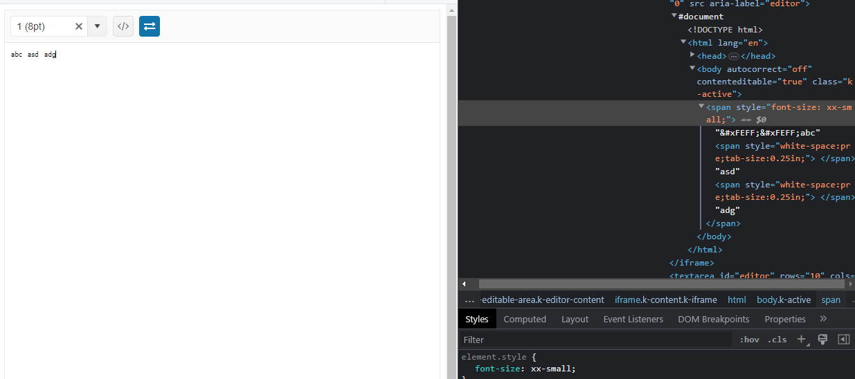 function onTabKeyClicked(e){ if (isTabOn){ e.preventDefault(); editor.exec("inserthtml", { value: '<span style="white-space:pre;tab-size:0.25in;">&#9;</span>' });
