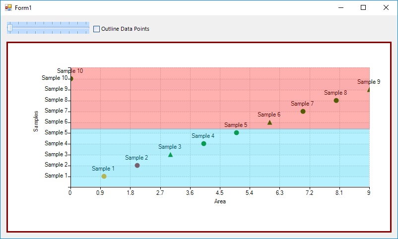 I'm interested in changing the background of the plotting area to a custom background where the top half is one color and the bottom half is another color. I've attached an image demonstrating the desired effect, though in the image the colors are "on-top" of the points, where I'd like them to be below. How might I achieve this with Telerik's RadChartView?