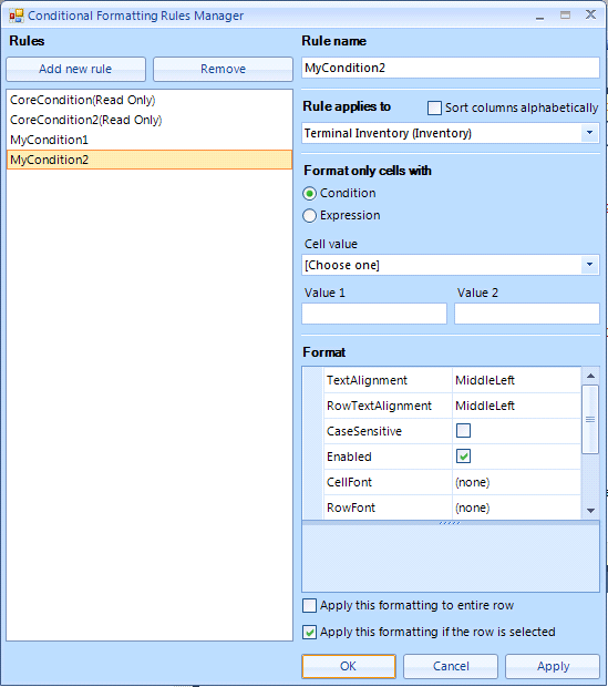 We have a data grid view which we would like to apply a few conditional rules programmatically. We would still like the end user to be able to add their own conditional formatting rules, however; we would like to block them from deleting the rules that we added via code. Please see the attached screenshot for an example. How would I go about doing this?