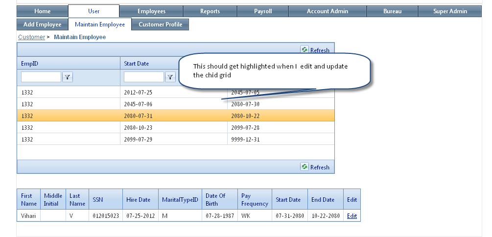 protected void RadGrid2_ItemCommand(object sender, GridCommandEventArgs e) { if (e.CommandName == RadGrid.EditCommandName) { string relationFieldKey = (e.Item as GridDataItem)["CustomerID"].Text; foreach (GridDataItem dataItem in RadGrid1.MasterTableView.Items) { if (dataItem["CustomerID"].Text == relationFieldKey) { dataItem.BackColor = System.Drawing.Color.Lime; // or dataItem.Selected=true; Session["itemIndex"] = dataItem.ItemIndex; break; } } } else if (e.CommandName == RadGrid.CancelCommandName || e.CommandName == RadGrid.UpdateCommandName || e.CommandName == RadGrid.PerformInsertCommandName) { RadGrid1.MasterTableView.Items[(int)Session["itemIndex"]].BackColor = new System.Drawing.Color(); // or RadGrid1.MasterTableView.Items[(int)Session["itemIndex"]].Selected=false; } }I hope this will prove helpful.