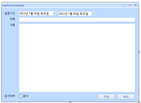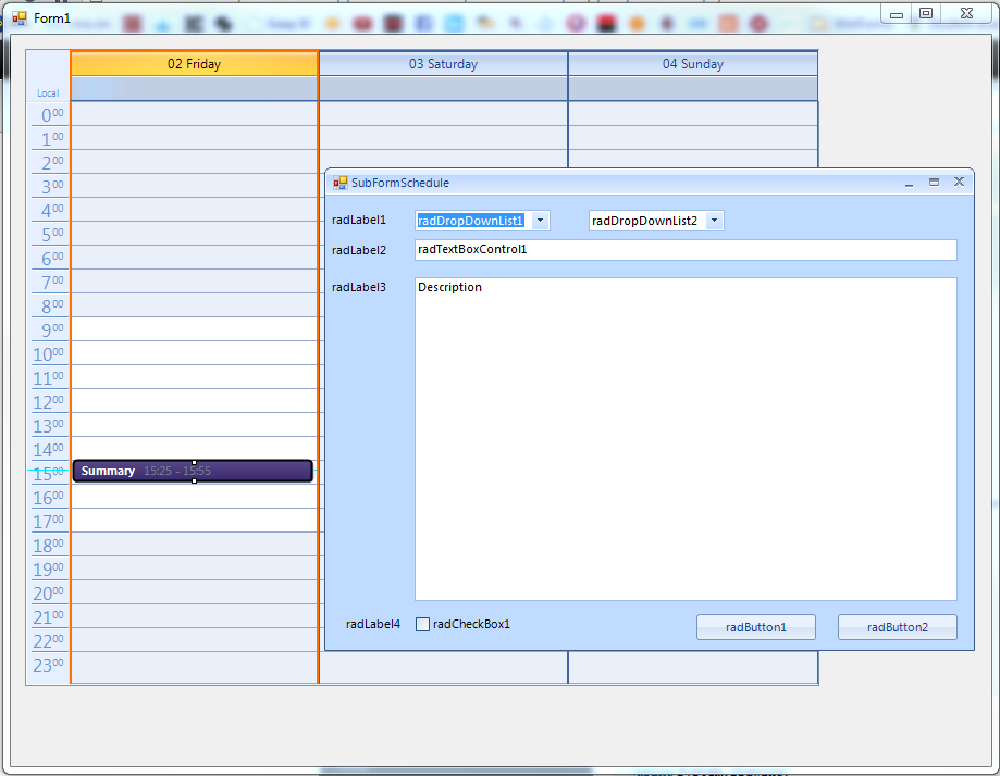 public partial class SubFormSchedule : Telerik.WinControls.UI.RadForm { private IEvent appointment = null; private ISchedulerData schedulerData = null; public SubFormSchedule(IEvent appointment) { InitializeComponent(); this.appointment = appointment; //to be continued... fill the form with the appropriate data this.radTextBoxControl2.Text = this.appointment.Description; } public SubFormSchedule() { InitializeComponent(); } }private void radScheduler1_AppointmentEditDialogShowing(object sender, AppointmentEditDialogShowingEventArgs e) { Appointment myAppointment = e.Appointment as Appointment; e.Cancel = true; SubFormSchedule myForm = new SubFormSchedule(myAppointment); myForm.Show(); //myForm.ShowDialog(); }I hope this information helps. Should you have further questions, I would be glad to help.