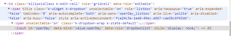 dayDropDownEditor : function (container, options) { $('<input id="' + options.field + '" data-bind="value:' + options.field + '"/>') .appendTo(container) .kendoDropDownList({ suggest: true, dataSource: [ {id:'1', name:'월요일', operDay: '월요일', isDeleted: false }, {operDay: '화요일', isDeleted: false }, {operDay: '수요일', isDeleted: false }, {operDay: '목요일', isDeleted: false }, {operDay: '금요일', isDeleted: false }, {operDay: '토요일', isDeleted: false }, {operDay: '일요일', isDeleted: false } ], dataTextField: 'operDay', dataValueField: 'operDay', valuePrimitive: true, select: function(e){ if(e.dataItem.isDeleted){ e.preventDefault(); alert("why?"); } }, template: kendo.template($("#template").html()) }); }