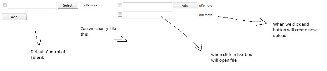in RadUpload Can we change select button into Add Button? . It mean when we click into textbox will open file and when we click to Add button will create new upload like normal Add Button in RadUpload , I also enclose a image which describe about what i say.Please help me.