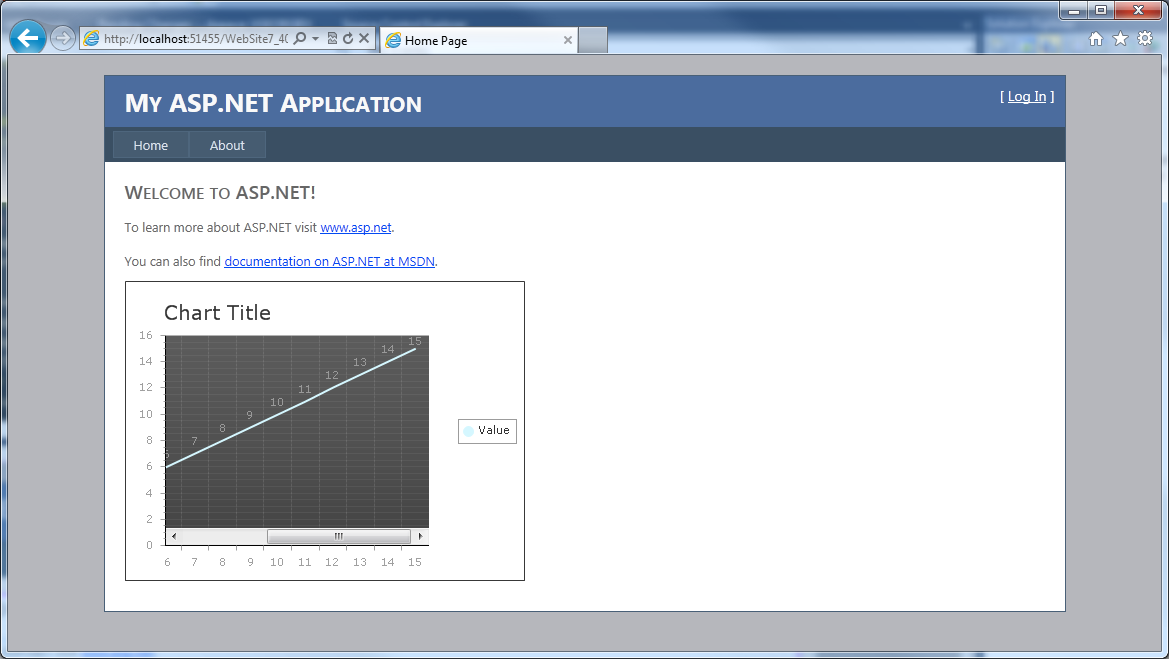 protected void Page_Load(object sender, EventArgs e) { ConnectionStringSettings connectionString = ConfigurationManager.ConnectionStrings["database"]; SqlConnection connection = new SqlConnection(connectionString.ConnectionString); SqlCommand command = new SqlCommand("selectDetails", connection); command.CommandType = CommandType.StoredProcedure; SqlDataAdapter dataAdapter = new SqlDataAdapter(); dataAdapter.SelectCommand = command; DataSet dataSet = new DataSet(); dataAdapter.Fill(dataSet, "info"); chart.ClientSettings.EnableZoom = true; chart.ClientSettings.ScrollMode = Telerik.Web.UI.ChartClientScrollMode.XOnly; chart.DataSource = dataSet.Tables["info"]; chart.DataBind(); }but I get this exception: