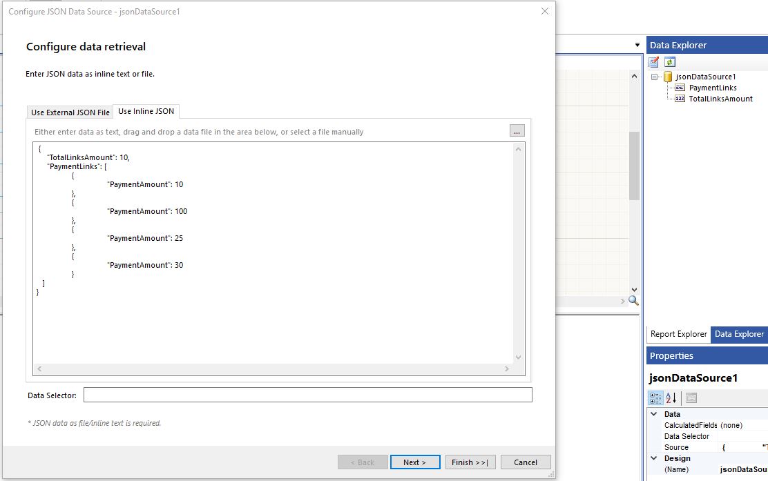 See attached sample report image to see. The report has jsonDataSource and it has collection property of "PaymentLinks" which has 4 items and each item of the collection has "PaymentAmount" integer value. The table is showing "PaymentAmount" property value.