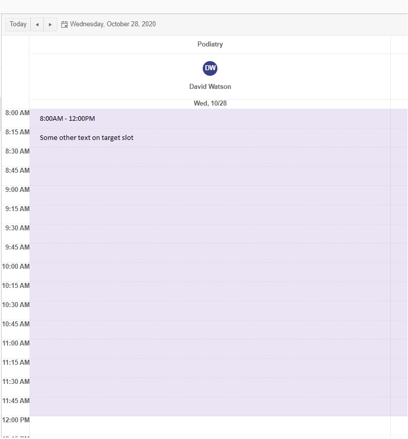 I know you can use kendoSchedulerTimeSlotTemplate like below, but this will apply text to all slots, and it doesn't have any access to the resource/grouping information, only date information is available?