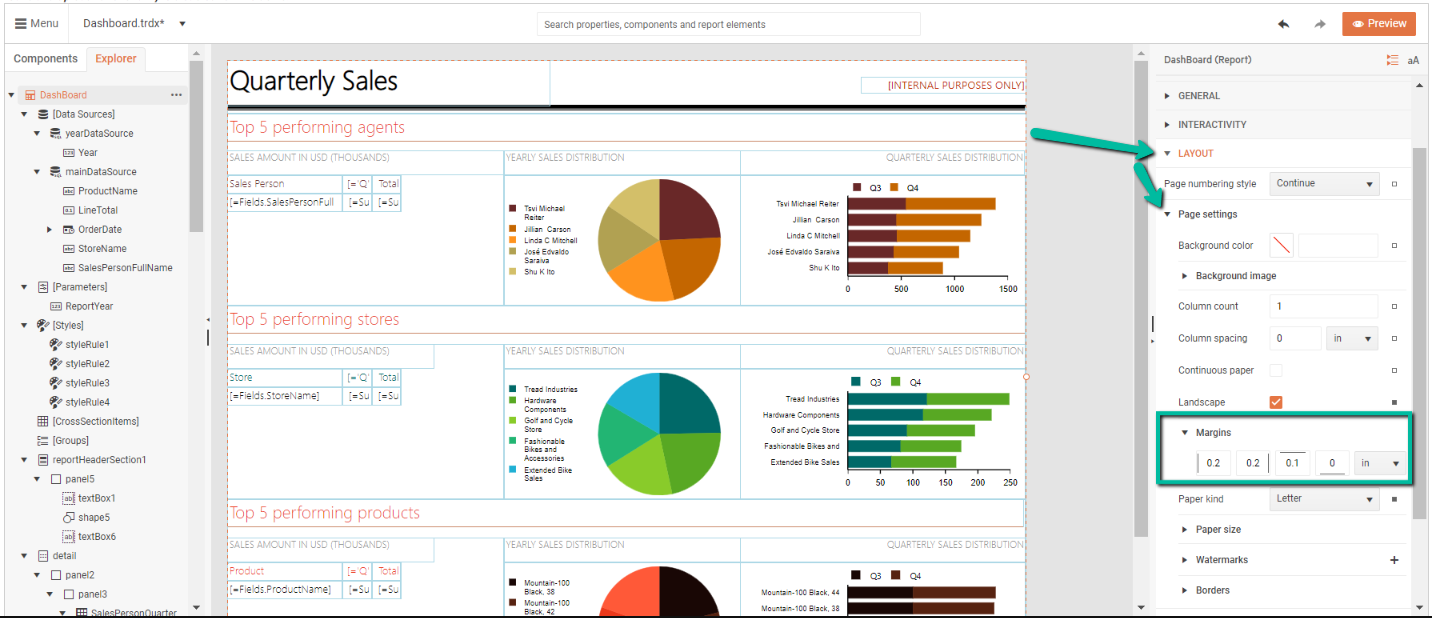 In case the Margins property is missing, then you need to update the Telerik Reporting references to at least the R2 2021 SP1 release because previously, the margins inputs were missing - The Margins of the Report PageSettings cannot be set in the Web Report Designer (telerik.com).