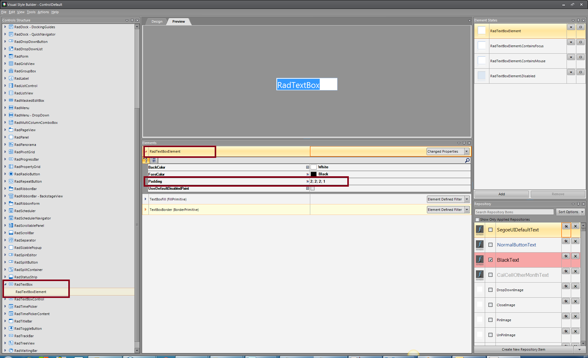 With this Padding property you are controlling the space between RadTextBox and the embedded control. The embedded MS TextBox is not created with our Telerik Presentation Framework (TPF) so it is independent from our styling properties like Padding. That is why it is not exposed like element in VisualStyleBuilder. In order to access the embedded MS TextBox you should use the following code snippet: