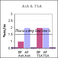 protected void SetAshGraph(RadChart RadChart, string bpAshValue, string apAshValue, string apTotSedi, string bpTotSedi, string ymax, string ymin, string steps, string title, string yaxislabel) { //------------------------------Setting Rad Chart Properties RadChart.Clear(); RadChart.RemoveAllSeries(); RadChart.Margins.Left = Unit.Percentage(25); RadChart.Margins.Bottom = Unit.Percentage(17); RadChart.Margins.Right = Unit.Percentage(10); RadChart.Title.Text = title; RadChart.Title.TextFont = new System.Drawing.Font("Verdana", 9, System.Drawing.FontStyle.Bold); RadChart.Title.Background.MainColor = Color.Transparent; RadChart.Title.Background.BorderColor = Color.Transparent; RadChart.Title.Background.FillStyle = FillStyle.Solid; //----------------------setting X porperties RadChart.XAxis.Clear(); //RadChart.XAxis.Label.TextFont = new System.Drawing.Font("Verdana", 3, System.Drawing.FontStyle.Regular); //RadChart.XAxis.Items.Font = new System.Drawing.Font("Verdana", 2, System.Drawing.FontStyle.Regular); RadChart.XAxis.AddItem(""); //RadChart.XAxis.Items[0].Visible = false; //RadChart.XAxis.Items[0].Value = -1; RadChart.XAxis.AddItem("BP \nAsh"); //RadChart.XAxis.Items[1].Value = 0; RadChart.XAxis.AddItem("AP \nAsh"); //RadChart.XAxis.Items[2].Value = 1; RadChart.XAxis.AddItem(""); //RadChart.XAxis.Items[3].Visible = false; //RadChart.XAxis.Items[3].Value = -2; RadChart.XAxis.AddItem("BP \nTSA"); //RadChart.XAxis.Items[4].Value = 2; RadChart.XAxis.AddItem("AP \nTSA"); //RadChart.XAxis.Items[5].Value = 3; RadChart.BarOverlapPercent = 0; RadChart.BarWidthPercent = 100; RadChart.XAxis.AddItem(""); //RadChart.XAxis.Items[6].Value = -3; //RadChart.XAxis.Items[6].Visible = false; RadChart.XAxis.AxisWidth = 1; RadChart.XAxis.AxisColor = Color.Black; RadChart.XAxis.Label.TextColor = Color.Black; //----------------------setting y porperties RadChart.YAxis.AddRange(double.Parse(ymin), double.Parse(ymax), double.Parse(steps)); // RadChart.YAxis.AutoScale = true; RadChart.YAxis.Label.Text = yaxislabel; RadChart.YAxis.Label.TextFont = new System.Drawing.Font("Verdana", 8, System.Drawing.FontStyle.Bold); RadChart.YAxis.AxisColor = Color.Black; RadChart.YAxis.Label.TextColor = Color.Black; RadChart.YAxis.AxisWidth = 1; RadChart.YAxis.DefaultItemColor = System.Drawing.Color.Black; //RadChart.YAxis.VisibleValues = ChartAxisVisibleValues.Positive; RadChart.XAxis.DefaultItemColor = System.Drawing.Color.Black; //RadChart.XAxis.VisibleValues = ChartAxisVisibleValues.Positive; //RadChart.XAxis.AutoScale = false; //RadChart.XAxis.AutoShrink = true; //------------------------------Adding Chart series Properties ChartSeries s = RadChart.CreateSeries("Series", Color.DarkViolet, ChartSeriesType.Bar); s.Items.Series.Appearance.FillStyle = FillStyle.Solid; s.Items.Series.Appearance.BorderColor = Color.Black; ChartSeriesItem items0 = new ChartSeriesItem(); items0.YValue = double.Parse(ymin); //items0.XValue = -1; s.Items.Add(items0); s.Items[0].Label = " "; //-----------------------------first Item i.e Bp/Ap reading ChartSeriesItem items1 = new ChartSeriesItem(); double dd; if (double.TryParse(bpAshValue, out dd)) { items1.YValue = dd; s.Items.Add(items1); //anks //s.Items[0].Appearance.MainColor = Color.FromArgb(153, 51, 101); //s.Items[0].Appearance.SecondColor = Color.FromArgb(153, 51, 101); s.Items[1].Appearance.MainColor = Color.FromArgb(198, 83, 138); s.Items[1].Appearance.SecondColor = Color.FromArgb(198, 83, 138); s.Items[1].Label = " "; } else { items1.YValue = dd; s.Items.Add(items1); s.Items[1].Label = " "; } ChartSeriesItem items2 = new ChartSeriesItem(); if (double.TryParse(apAshValue, out dd)) { items2.YValue = dd; s.Items.Add(items2); //anks //s.Items[1].Appearance.MainColor = Color.FromArgb(154, 153, 255); //s.Items[1].Appearance.SecondColor = Color.FromArgb(154, 153, 255); s.Items[2].Appearance.MainColor = Color.FromArgb(180, 179, 255); s.Items[2].Appearance.SecondColor = Color.FromArgb(180, 179, 255); s.Items[2].Label = " "; } ChartSeriesItem items3 = new ChartSeriesItem(); items3.YValue = double.Parse(ymin); //items3.XValue = -2; s.Items.Add(items3); s.Items[3].Label = " "; ChartSeriesItem items4 = new ChartSeriesItem(); if (double.TryParse(bpTotSedi, out dd)) { items4.YValue = dd; s.Items.Add(items4); //anks //s.Items[2].Appearance.MainColor = Color.FromArgb(153, 51, 101); //s.Items[2].Appearance.SecondColor = Color.FromArgb(153, 51, 101); s.Items[4].Appearance.MainColor = Color.FromArgb(198, 83, 138); s.Items[4].Appearance.SecondColor = Color.FromArgb(198, 83, 138); s.Items[4].Label = " "; } ChartSeriesItem items5 = new ChartSeriesItem(); if (double.TryParse(apTotSedi, out dd)) { items5.YValue = dd; s.Items.Add(items5); //anks //s.Items[3].Appearance.MainColor = Color.FromArgb(154, 153, 255); //s.Items[3].Appearance.SecondColor = Color.FromArgb(154, 153, 255); s.Items[5].Appearance.MainColor = Color.FromArgb(180, 179, 255); s.Items[5].Appearance.SecondColor = Color.FromArgb(180, 179, 255); s.Items[5].Label = " "; } ChartSeriesItem items6 = new ChartSeriesItem(); items6.YValue = double.Parse(ymin); //items6.XValue = -3; s.Items.Add(items6); s.Items[6].Label = " "; RadChart.AddChartSeries(s); //anks ChartSeries s1 = RadChart.CreateSeries("LineSeries", Color.Black, ChartSeriesType.Line); s1.Items.Series.Appearance.FillStyle = FillStyle.Solid; s1.Items.Series.Appearance.BorderColor = Color.Black; s1.Items.Series.ShowLabels = true; //RadChart.XAxis.LayoutStyle = ChartAxisLayoutStyle.Between; RadChart.XAxis.LayoutStyle = ChartAxisLayoutStyle.Normal; ChartSeriesItem LineItems0 = new ChartSeriesItem(); if (double.TryParse(bpAshValue, out dd)) { LineItems0.YValue = 1.5; s1.Items.Add(LineItems0); s1.Items[0].Appearance.MainColor = Color.Black; s1.Items[0].Label = "This is a strip line line li"; s1.Items[0].Series.LabelAppearance.TextFont = new Font("Times New Roman", 9, FontStyle.Bold | FontStyle.Italic); s1.Items[0].Series.LabelAppearance.TextColor = Color.Black; //s1.Items[0].Series.LabelAppearance.TextColor 