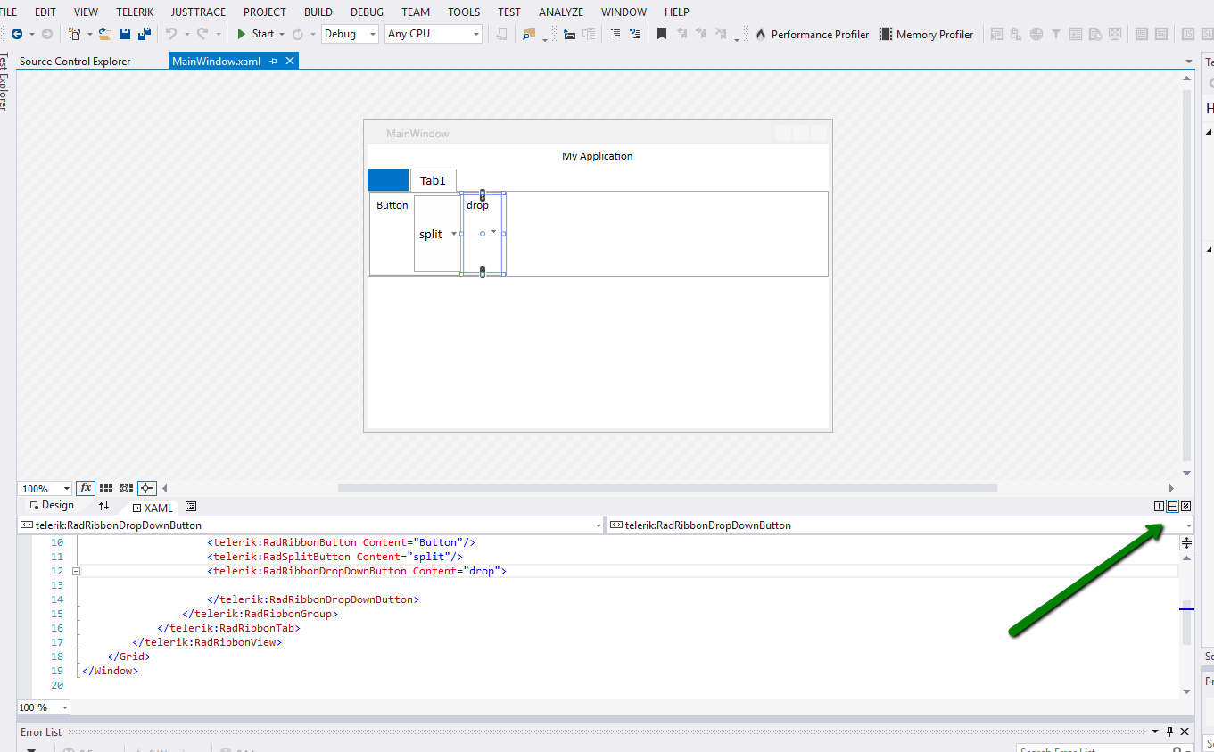 The issue is really annoying and I increased its priority because it blocks the xaml writing. Can you tell us if it is reproducible with each ribbon control or only clicking on RadRibbonDropDownButton/SplitButton brings the design view into full screen?