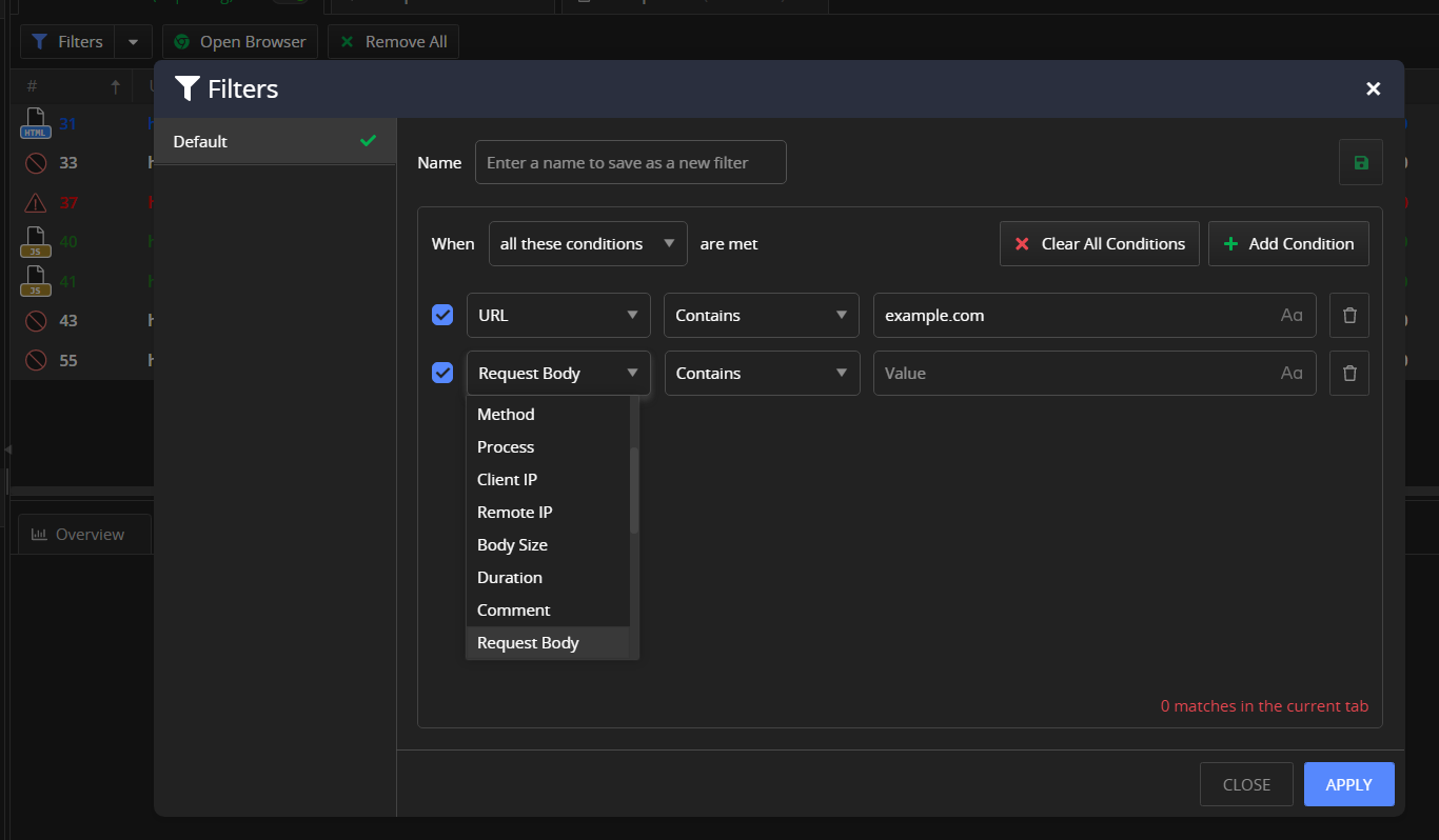 Lets say I'd like to review all captured sessions that contain "collect" in their URL/path at some point but I don't wanna scroll through all sessions. For this purpose I'm just using the search field now.