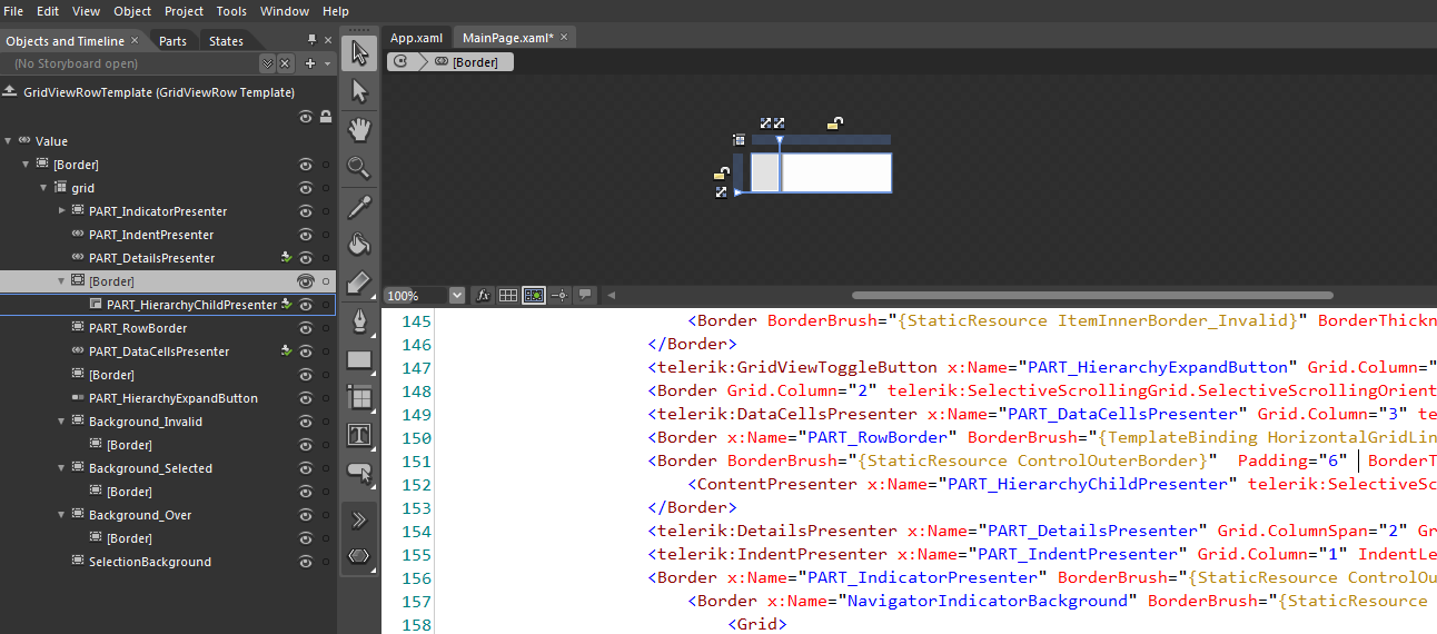 <telerik:RadGridView x:Name="ParentGrid" ...> <telerik:RadGridView.Columns> ... </telerik:RadGridView.Columns> <telerik:RadGridView.ChildTableDefinitions> <telerik:GridViewTableDefinition/> </telerik:RadGridView.ChildTableDefinitions> <telerik:RadGridView.HierarchyChildTemplate> <DataTemplate> <telerik:RadGridView ...> ... </telerik:RadGridView> </DataTemplate> </telerik:RadGridView.HierarchyChildTemplate></telerik:RadGridView>When the hierarchy child expands there is a thick grey border around the child grid. I am trying to remove this border.