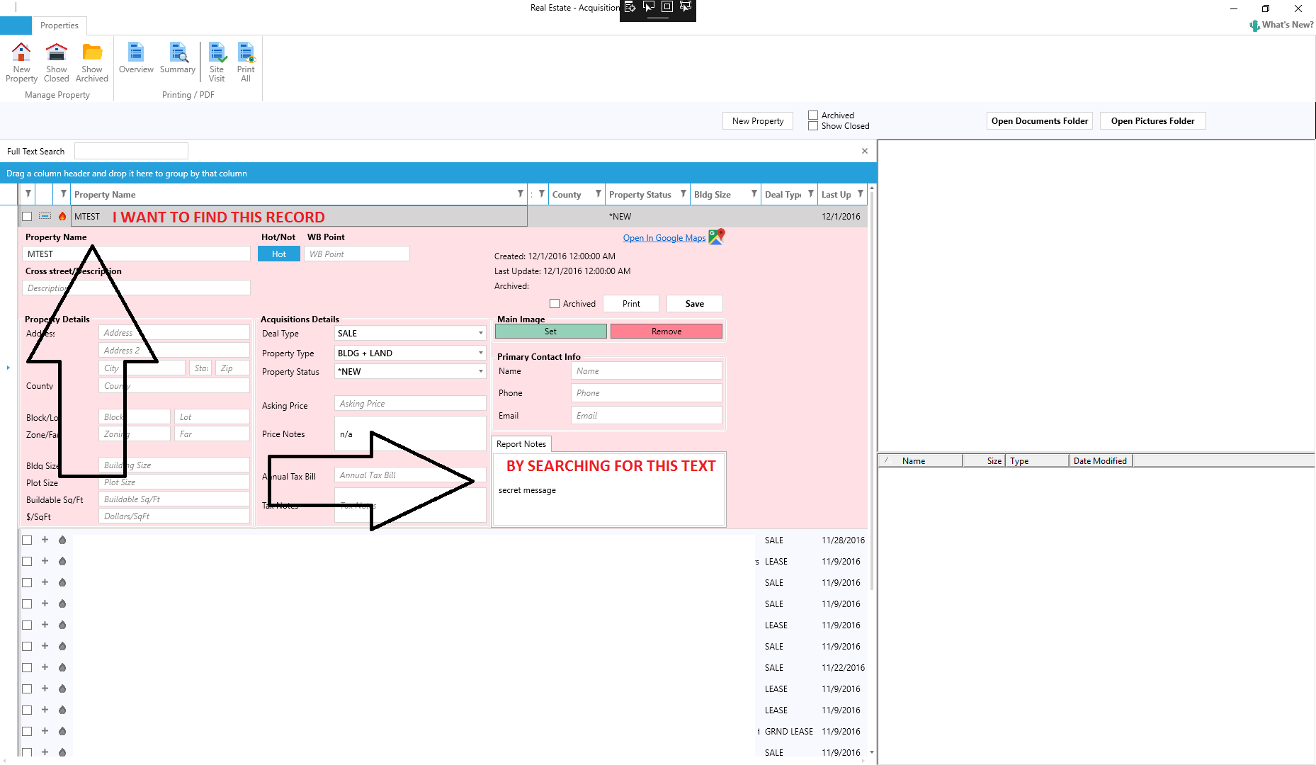 For example, the datagrid shows locations and address of buildings. lets say i want to find a record where 'Comments' column contains "secret message"