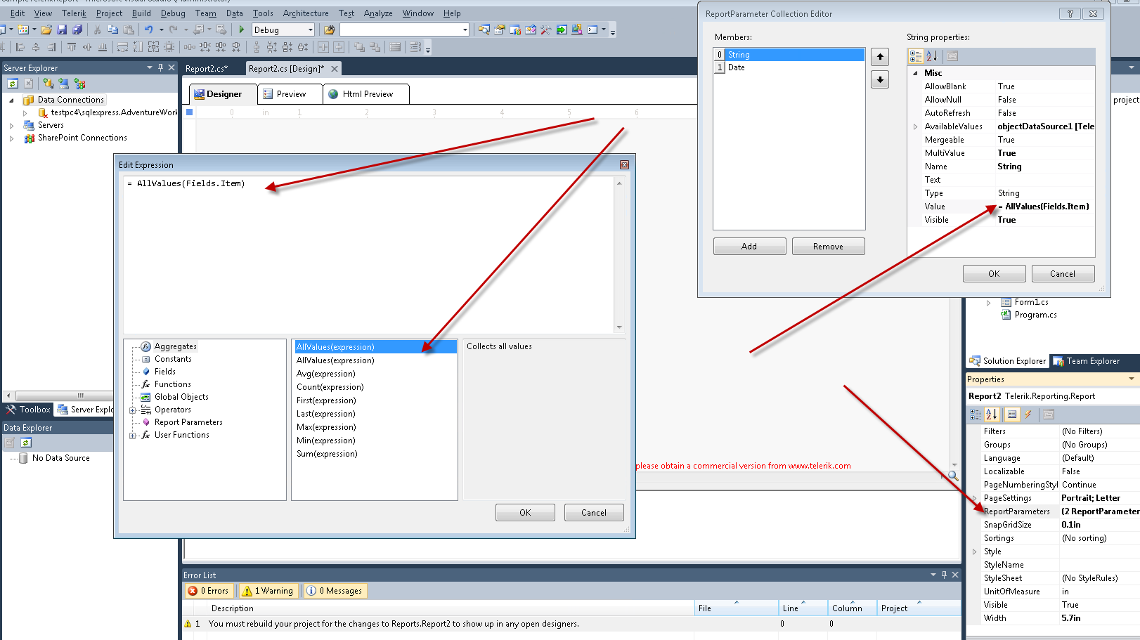 I am using standalone telerik report designer Q3 2014. I can't see the function =AllValues.