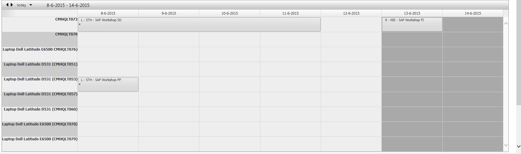 <telerik:RadScheduler runat="server" ID="rscLendingService" GroupBy="LendingService" GroupingDirection="Vertical" RowHeight="50px" Height="100%" OnTimeSlotCreated="rscLendingService_TimeSlotCreated" AppointmentStyleMode="Auto" DataKeyField="MachineID" FirstDayOfWeek="Monday" LastDayOfWeek="Sunday" SelectedView="TimelineView" TimelineView-NumberOfSlots="7" TimelineView-SlotDuration="1.00:00:00" TimelineView-ShowInsertArea="false" AllowDelete="false" AllowEdit="false" AllowInsert="false"> <TimelineView UserSelectable="false"></TimelineView> <MultiDayView UserSelectable="false"></MultiDayView> <DayView UserSelectable="false"></DayView> <WeekView UserSelectable="false"></WeekView> <MonthView UserSelectable="false"></MonthView> <TimeSlotContextMenuSettings EnableDefault="true"></TimeSlotContextMenuSettings> <AppointmentContextMenuSettings EnableDefault="true"></AppointmentContextMenuSettings> </telerik:RadScheduler>and this is my code behind, with offcourse my own database.