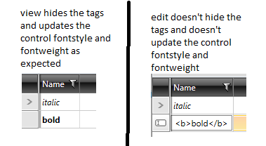 However, please note that you will also need to introduce some logic in order to restore the bolded/italicized text back to its string representation, when the cell gets out of edit mode. If the tags are removed when the cell enters edit mode, after the cells exits edit mode, the bound property string will not contain the tags. That said, I cannot say for certain whether this approach would work in all scenarios.
