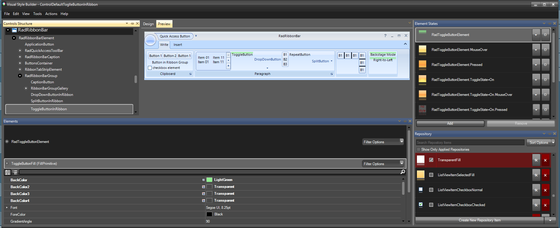 In order to theme the RadToggleButtonElements in RadRibbonBar, you would need to work with the ribbon bar theme and modify the ToggleButtonInRibbon node.