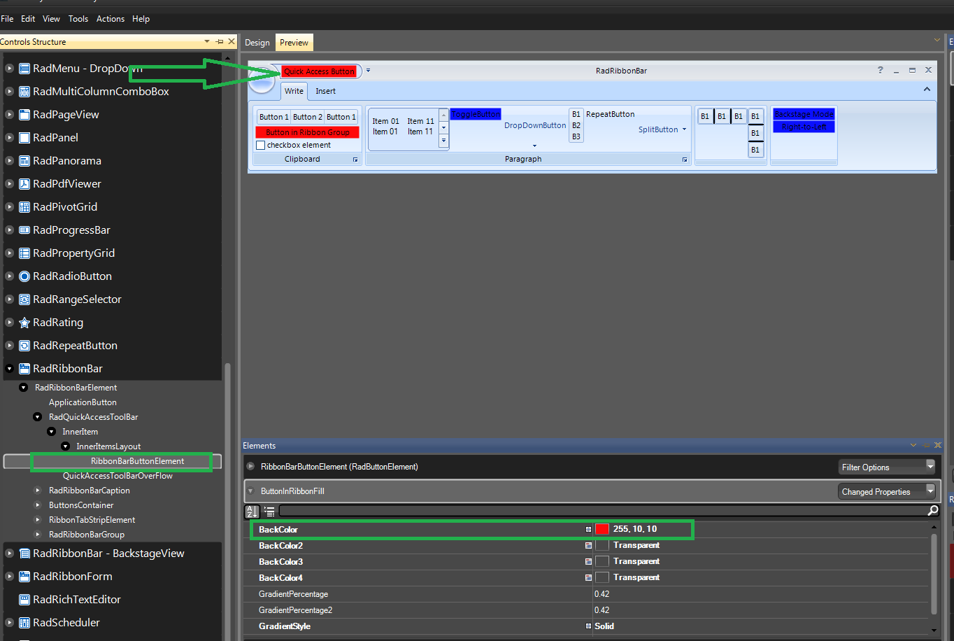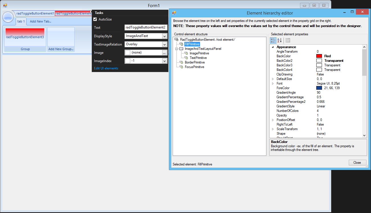 this.radToggleButtonElement1.ButtonFillElement.BackColor = Color.Green;I hope this helps. Should you have further questions please do not hesitate to write back.