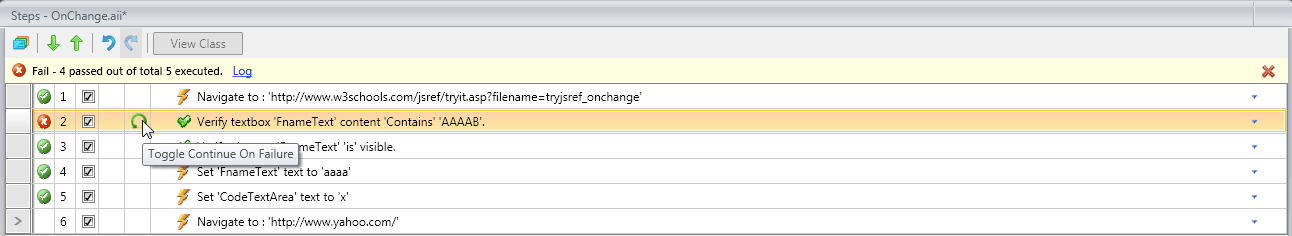 Failure Information: ~~~~~~~~~~~~~~~Exception thrown executing coded step: '[oldLogin_IfSelect_DoThis] : If PossibleSelectControl exists, select index 0 to cause it to be replaced by a text control'.InnerException:System.TimeoutException: Wait for condition has timed out at ArtOfTest.Common.WaitSync.CheckResult(WaitSync wait, String extraExceptionInfo) at ArtOfTest.Common.WaitSync.For[T,V](Func`3 func, T target, V custom, Boolean invertCondition, Int32 timeout) at ArtOfTest.WebAii.Synchronization.Wait.ForCondition(Func`3 condition, Boolean invertCondition, Object custom, Int32 timeout) at ArtOfTest.WebAii.Synchronization.Wait.ForExists(Int32 timeout, Boolean refreshElement) at ArtOfTest.WebAii.TestTemplates.HtmlElementContainer.Get(HtmlFindExpression expr, Boolean waitOnElement, Int32 timeout) at ArtOfTest.WebAii.TestTemplates.HtmlElementContainer.Get(HtmlFindExpression expr) at ArtOfTest.WebAii.TestTemplates.HtmlElementContainer.Get[TControl](HtmlFindExpression expr) at ArtOfTest.WebAii.TestTemplates.HtmlElementContainer.Get[TControl](String[] clauses) at CalendarTry1.Pages.WorkspaceLoginPage.get_LoginlistSelect() in c:\Documents and Settings\username\My Documents\WebUI Test Studio Projects\CalendarTry1\Pages.g.cs:line 73 at CalendarTry1.oldLogin.oldLogin_IfSelect_DoThis() in c:\Documents and Settings\username\My Documents\WebUI Test Studio Projects\CalendarTry1\oldLogin.aii.cs:line 137------------------------------------------------------------'11/16/2010 9:39:58 AM' - Detected a failure. Step is marked 'ContinueOnFailure=True' continuing test execution.But the biggest reason that this fails to work is that when a single step fails, the entire test fails. The "Continue On Failure" doesn't change the fact that the test itself reports a failure as shown below.