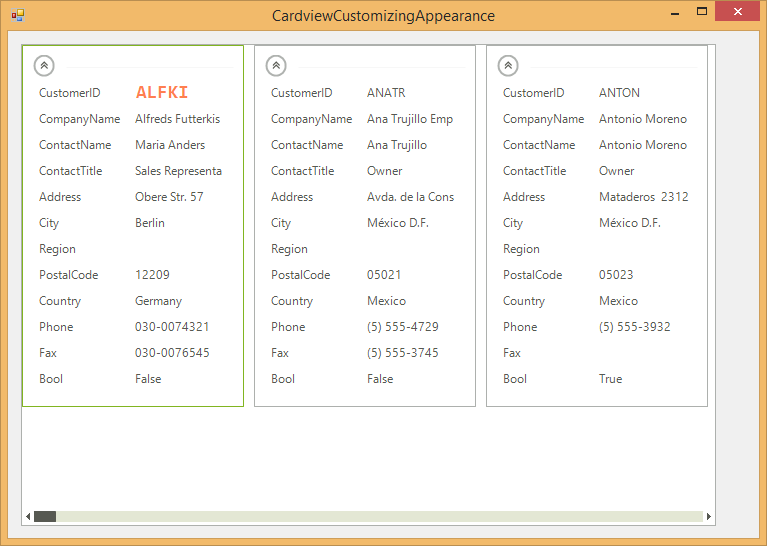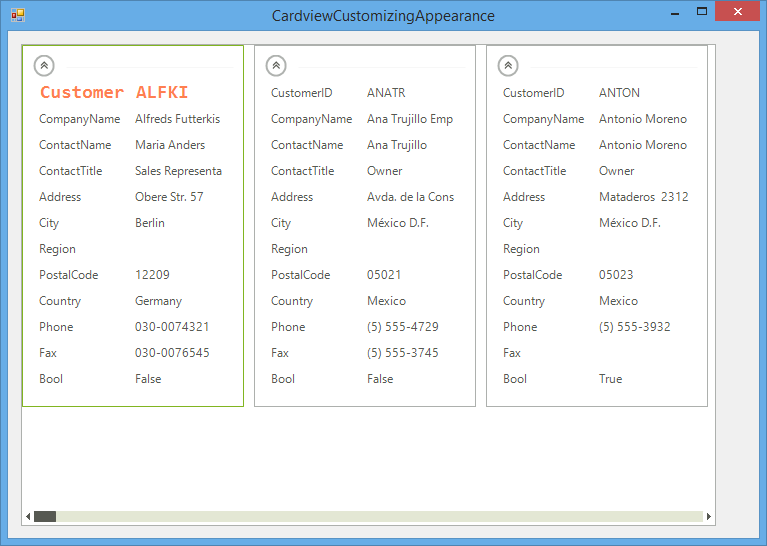 private void radCardView1_CardViewItemFormatting1(object sender, CardViewItemFormattingEventArgs e){ string value = e.VisualItem.Data["CustomerID"].ToString(); CardViewItem item = e.Item as CardViewItem; if (item != null && item.FieldName == "CustomerID" && value == "ALFKI") { e.Item.NumberOfColors = 1; e.Item.ForeColor = Color.Coral; e.Item.BorderColor = Color.LightBlue; e.Item.Font = font; } else { e.Item.ResetValue(LightVisualElement.NumberOfColorsProperty, Telerik.WinControls.ValueResetFlags.Local); e.Item.ResetValue(LightVisualElement.ForeColorProperty, Telerik.WinControls.ValueResetFlags.Local); e.Item.ResetValue(LightVisualElement.BorderColorProperty, Telerik.WinControls.ValueResetFlags.Local); e.Item.ResetValue(LightVisualElement.FontProperty, Telerik.WinControls.ValueResetFlags.Local); }}I am also attaching a screenshot showing the result on my end Let me know if you have other questions.